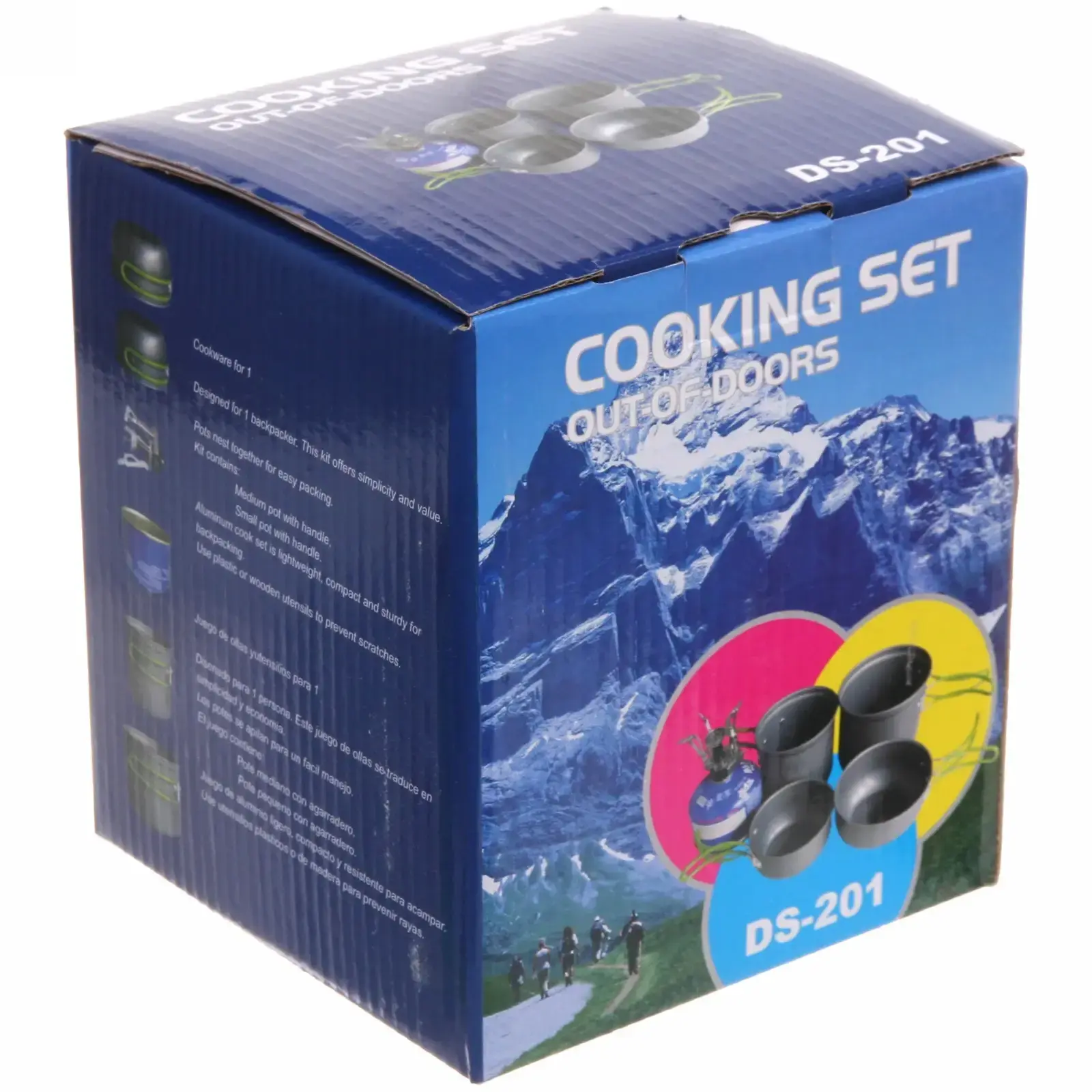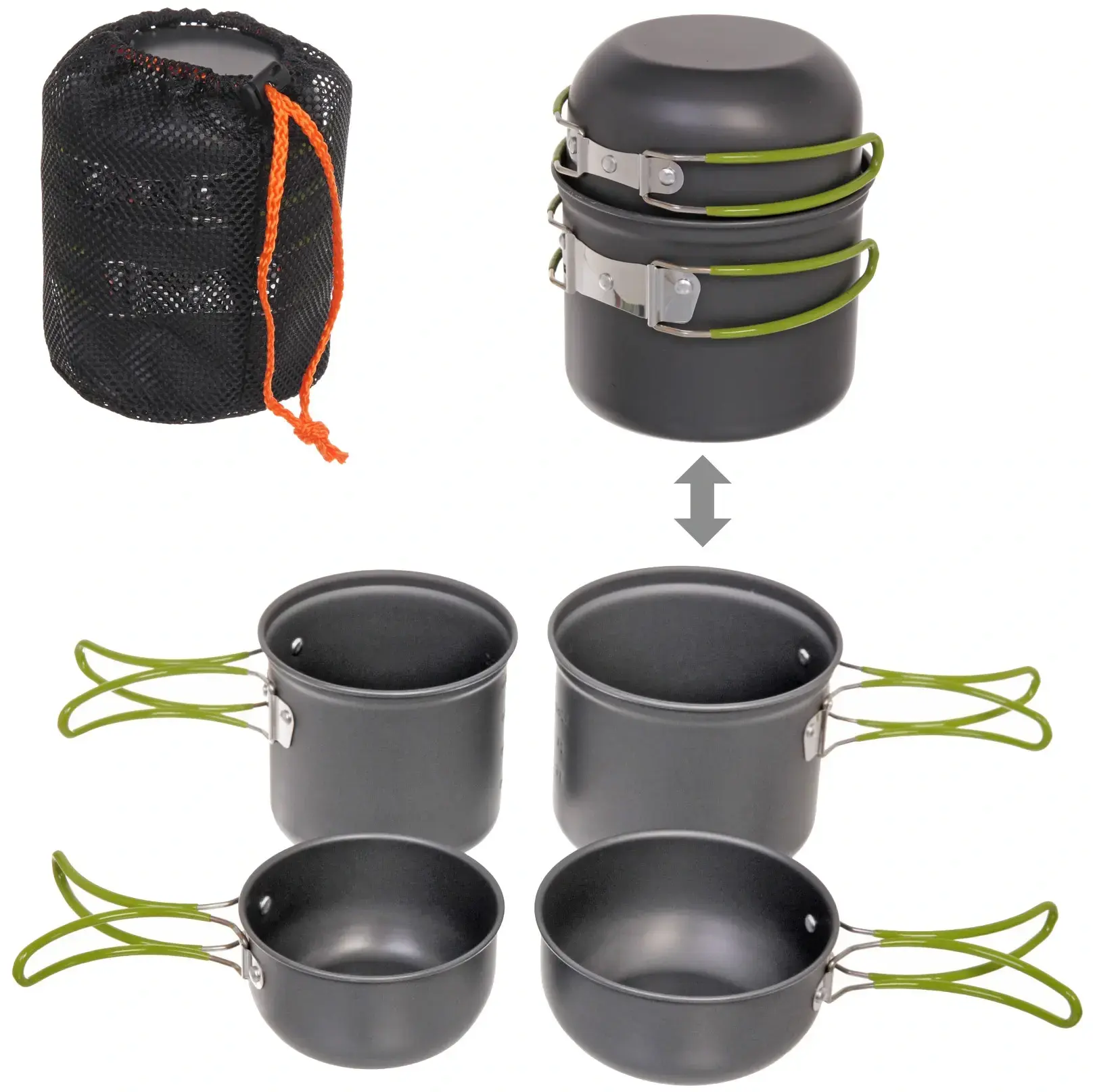 В набор входят: котелок 0,8л для каш и гарниров, котелок 1л для супов и напитков, универсальная крышка. Все элементы складываются в компактный блок размером 18×15см. Сетчатая упаковка с оранжевым шнурком защищает от пыли и позволяет быстро просушить посуду после мытья.