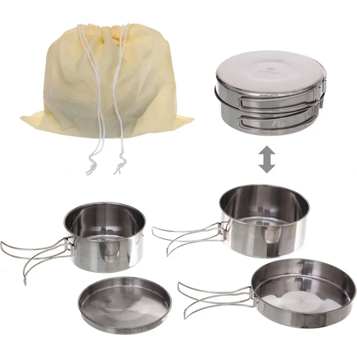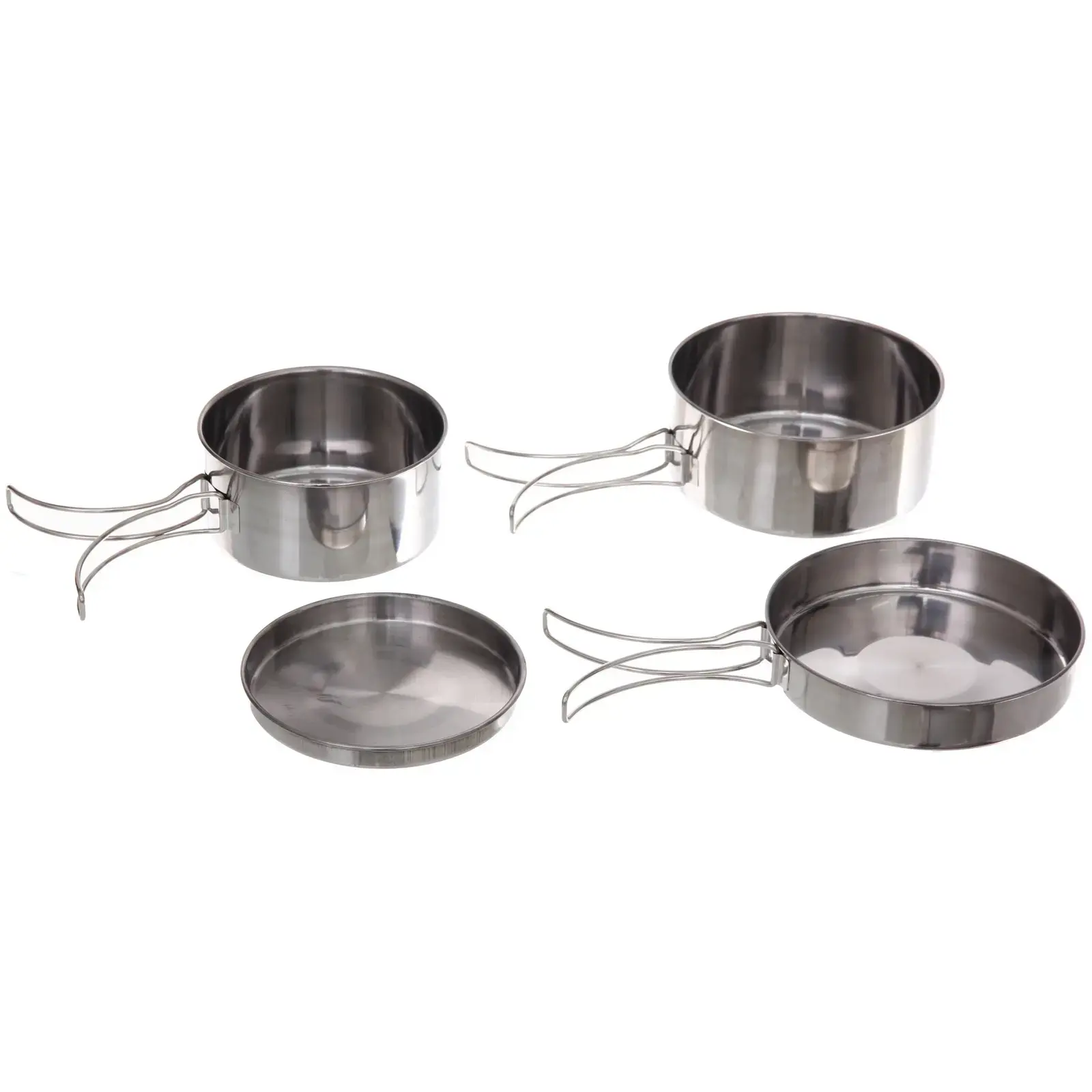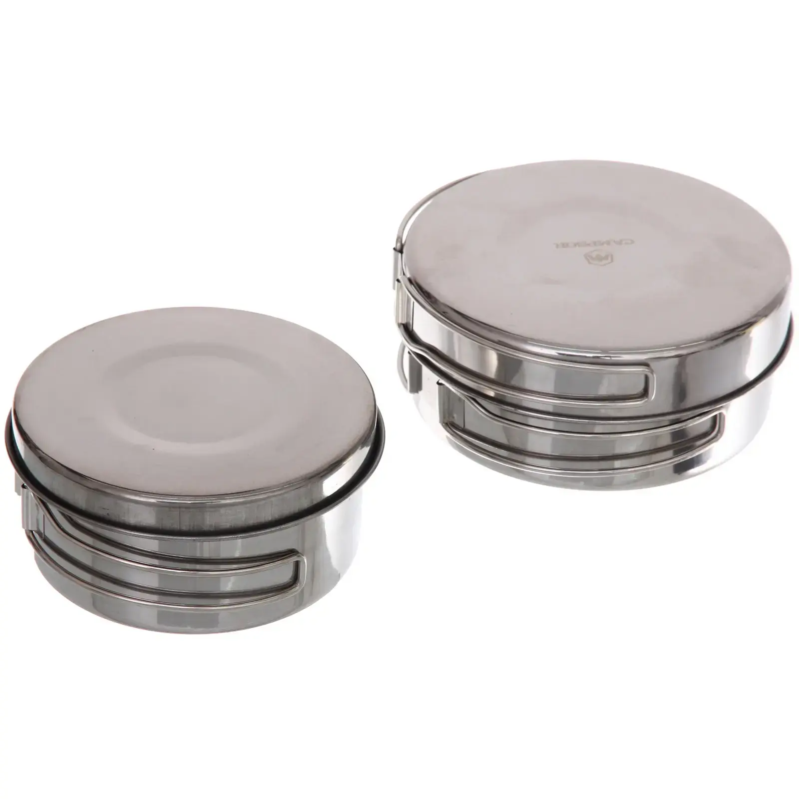 Этот набор включает два котелка объемом 970 мл и 700 мл, сковороду диаметром 15 см и тарелку диаметром 13 см. Все элементы выполнены из нержавеющей стали, что гарантирует долговечность и легкость в уходе. Набор идеально подходит для кемпинга, пикников и путешествий, а также для использования на даче.