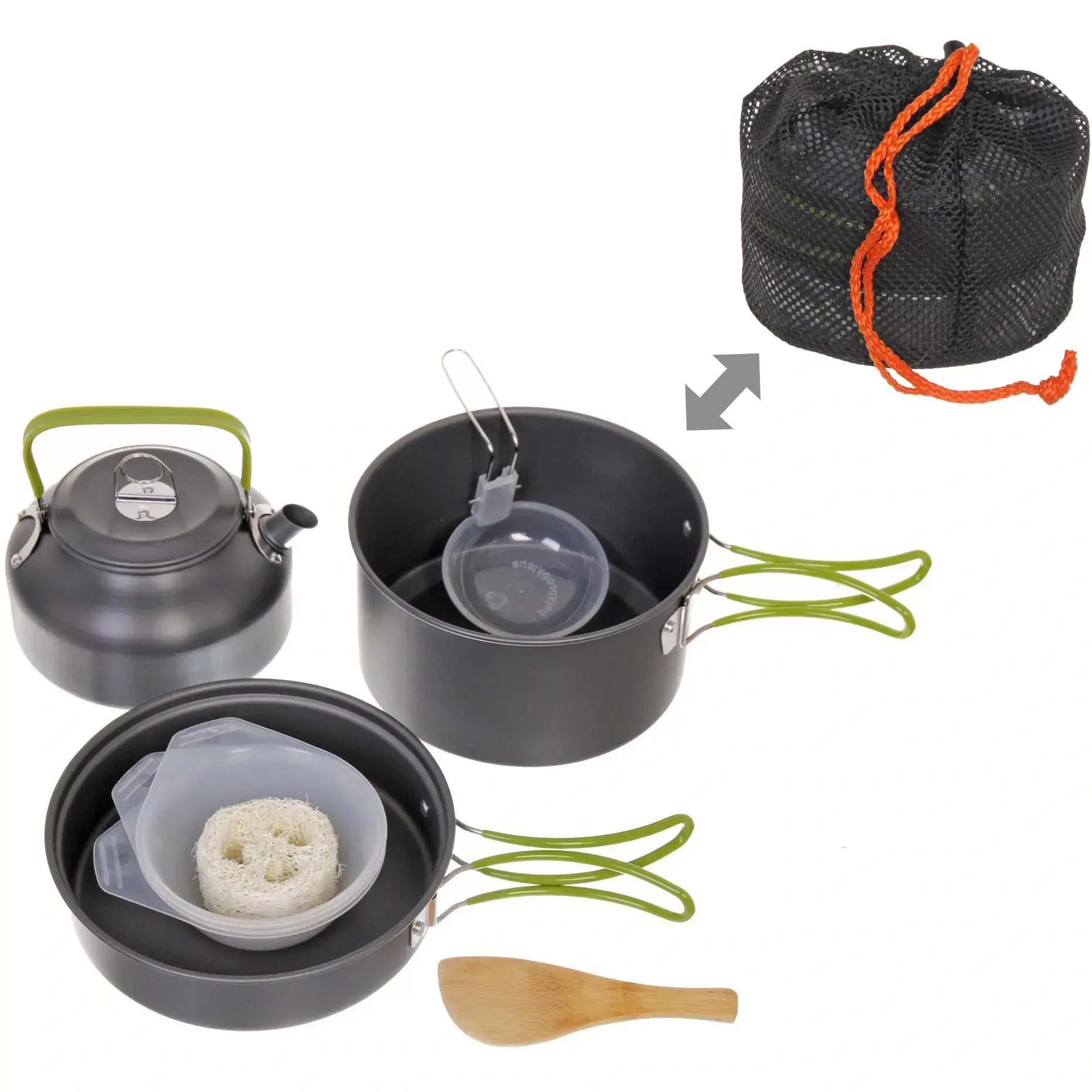 Благодаря продуманной конструкции все элементы набора помещаются друг в друга, существенно экономя место в рюкзаке. Сетчатый мешок для переноски защищает остальные вещи от загрязнений.
