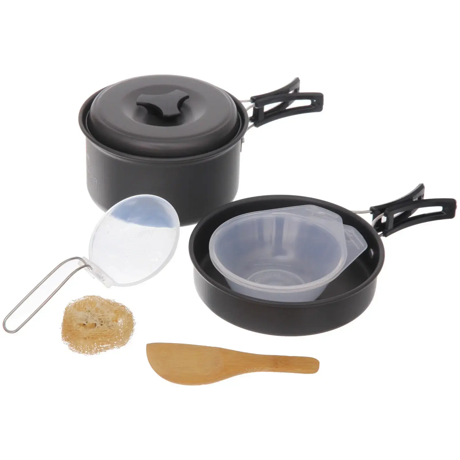Этот набор идеально подходит для туристов, любителей пикников и активного отдыха. В него входят: черная кастрюля с крышкой, сковорода, мерный стакан, деревянная ложка, губка для мытья и сетчатый мешок для удобного хранения. Все элементы набора компактно упакованы, что позволяет легко транспортировать их в рюкзаке.