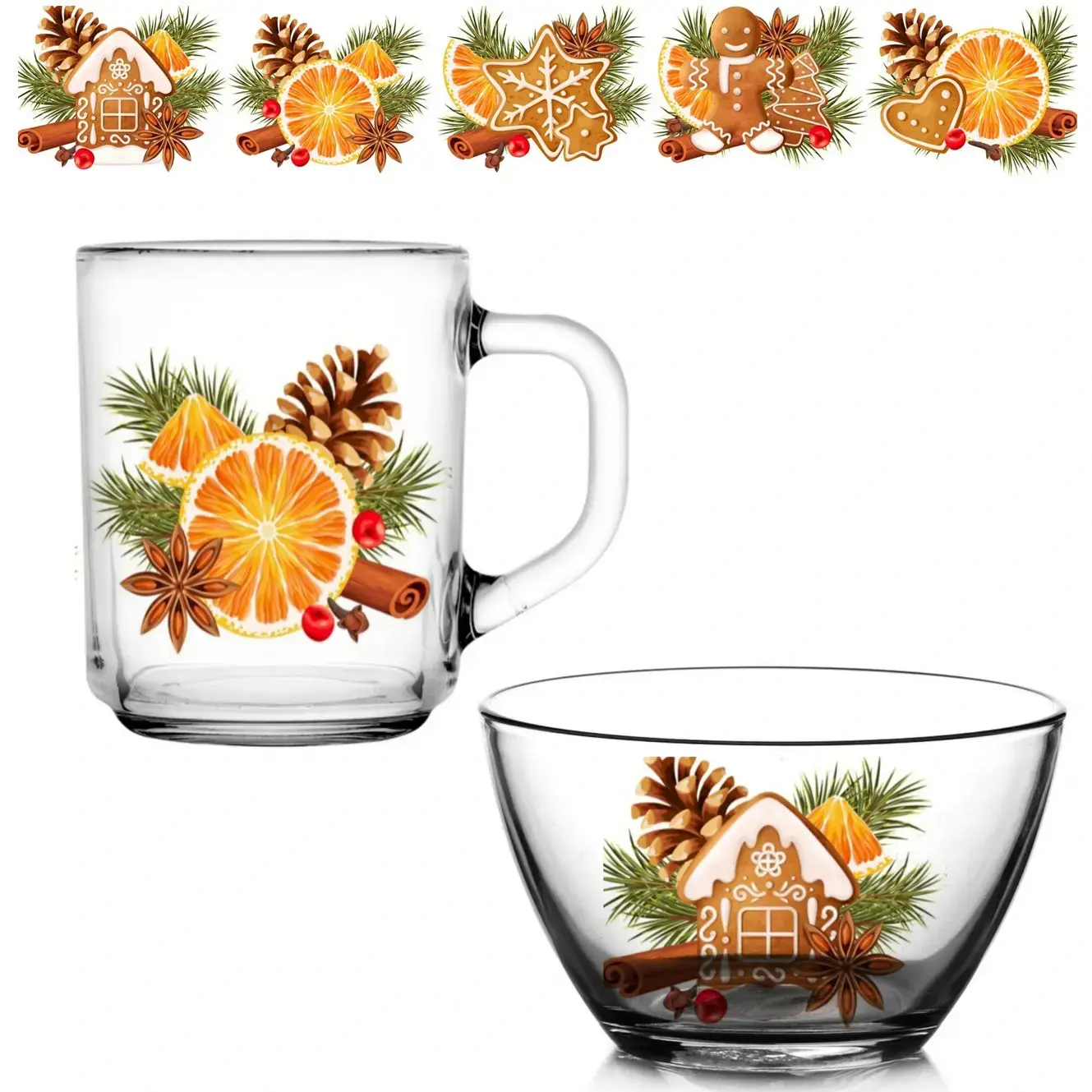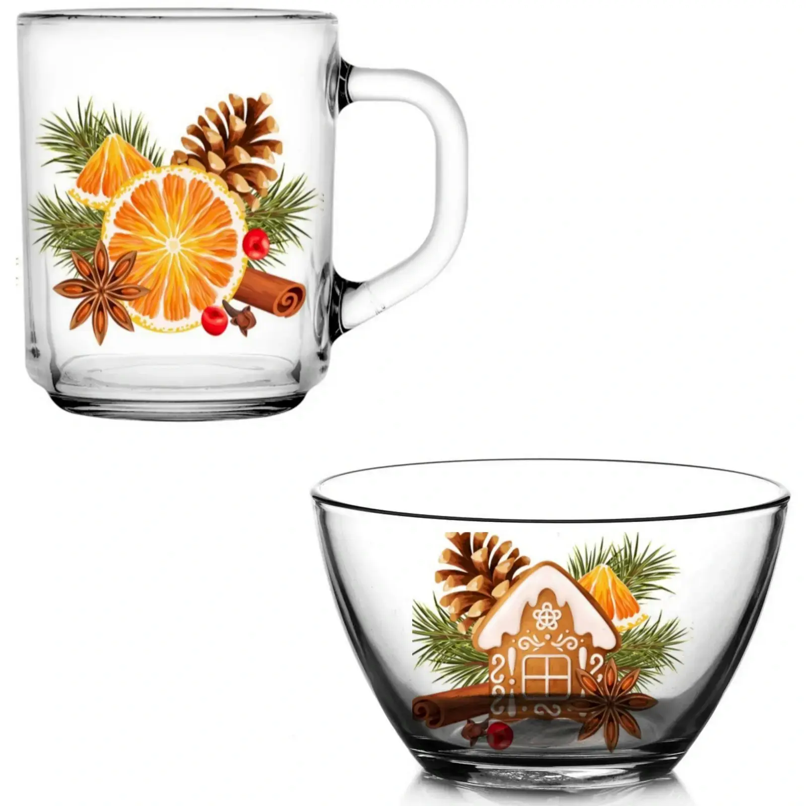 Салатник и кружка имеют прозрачный цвет и оригинальный дизайн, украшенный зимними мотивами: дольками апельсина, шишками, корицей и красными ягодами. Эти элементы создают уютную атмосферу и подчеркивают праздничное настроение. Набор отлично подходит для семейных встреч, дружеских посиделок и новогодних праздников.