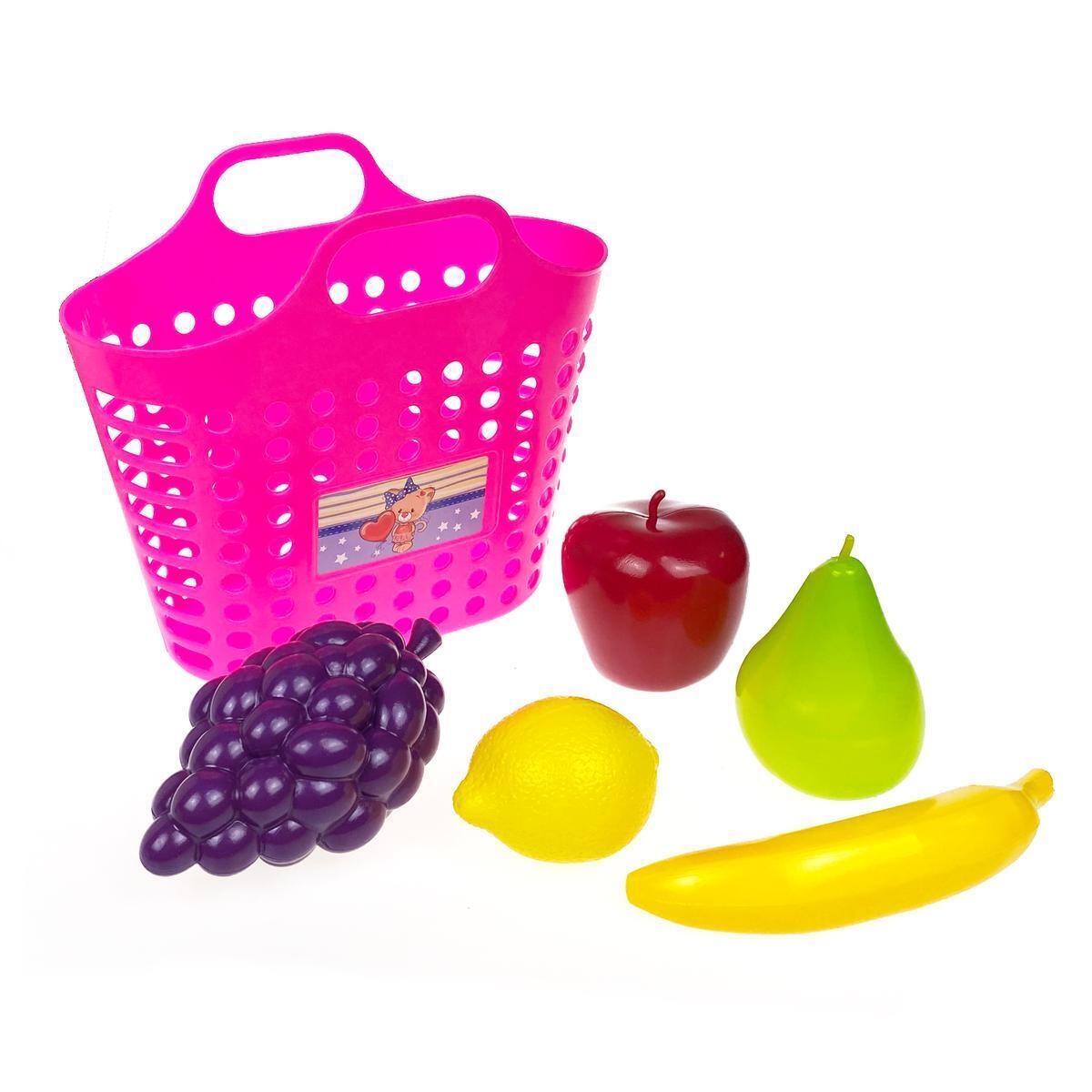 Комплектация: 1 корзинка (розовый пластик), 5 фруктов (яблоко, банан, груша, лимон, виноград). Соответствует требованиям ТР ТС 008/2011. Произведено в России из экологичных материалов.