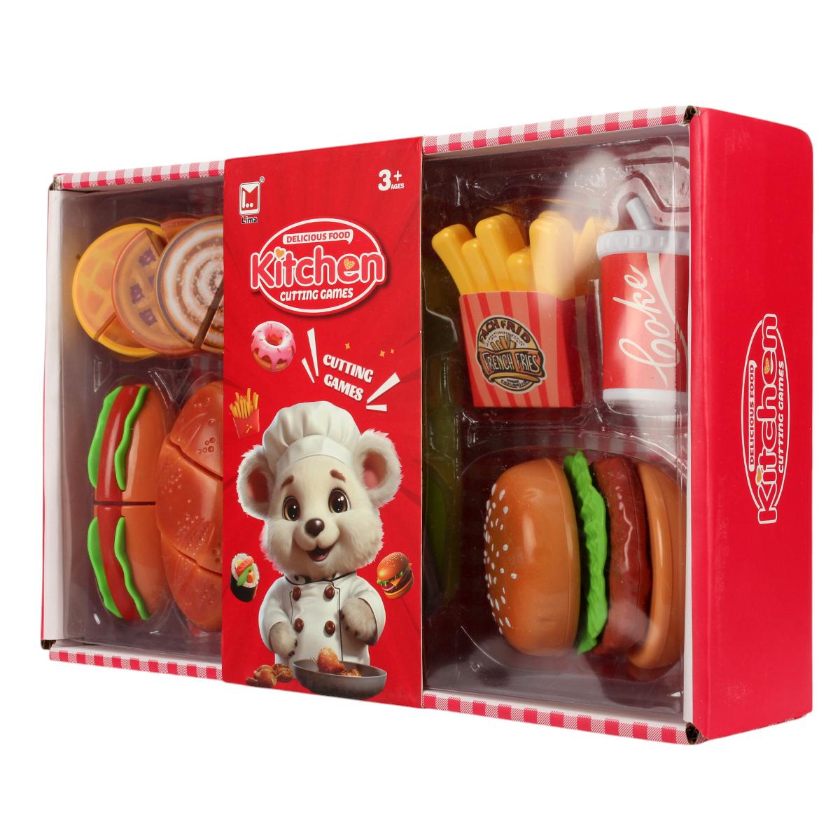 Этот красочный набор игрушечных продуктов превратит обычные игры в настоящее приключение. Маленький шеф-повар сможет готовить бургеры, нарезать овощи и подавать напитки, развивая воображение и мелкую моторику.