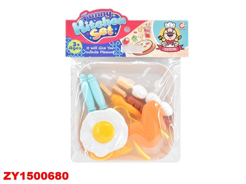 Компактная упаковка (15,0×9,5×3,5 см) позволяет брать набор с собой в дорогу или на прогулку. Количество предметов — 9: разнообразные овощи, сосиска, яйца, куриная ножка и кухонные инструменты. Все выполнено из гладкого пластика, безопасного для малышей.