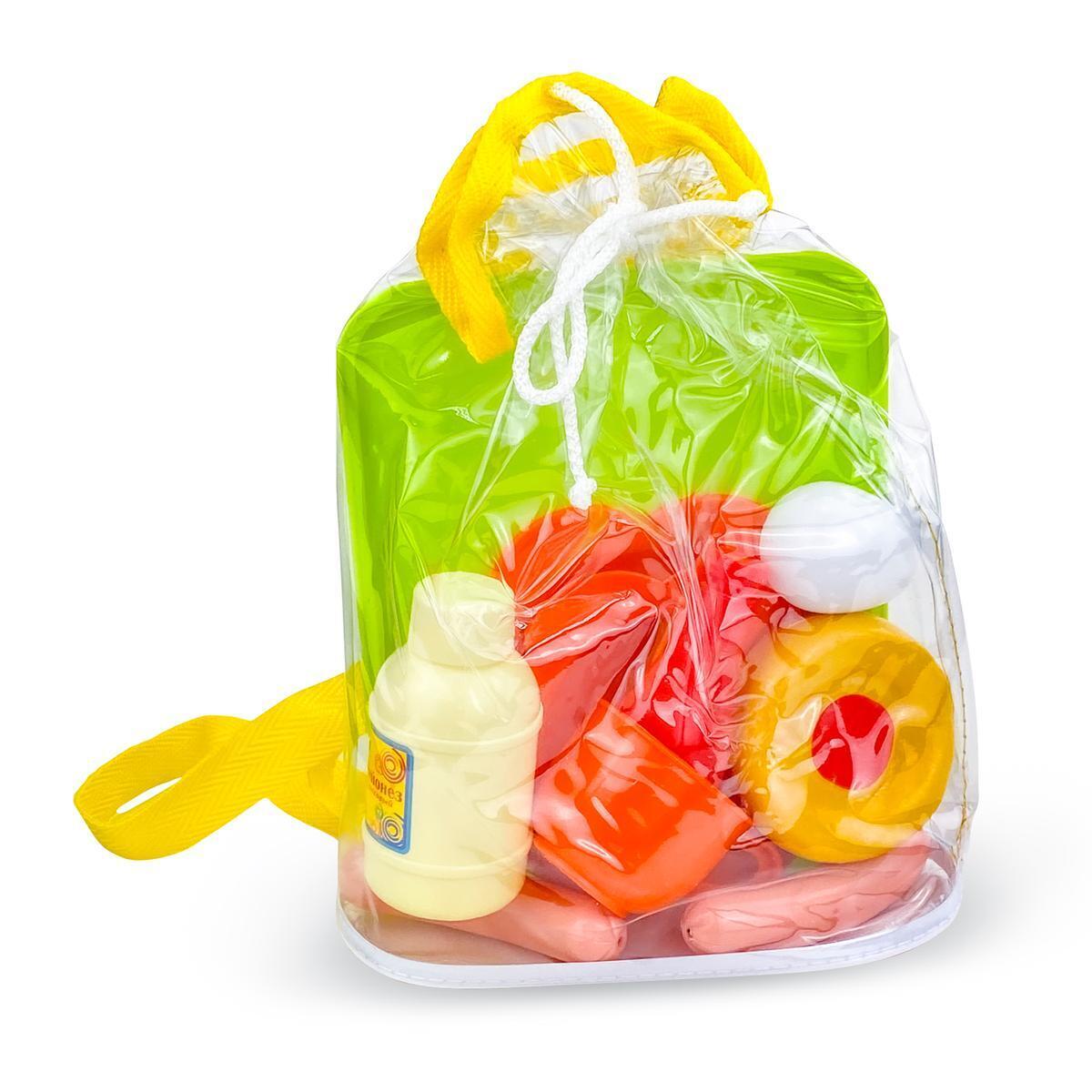 Игровой набор "Завтрак с плюшкой" для детей, пластиковая посуда и еда, 26х8.5х20см, зеленая сумка