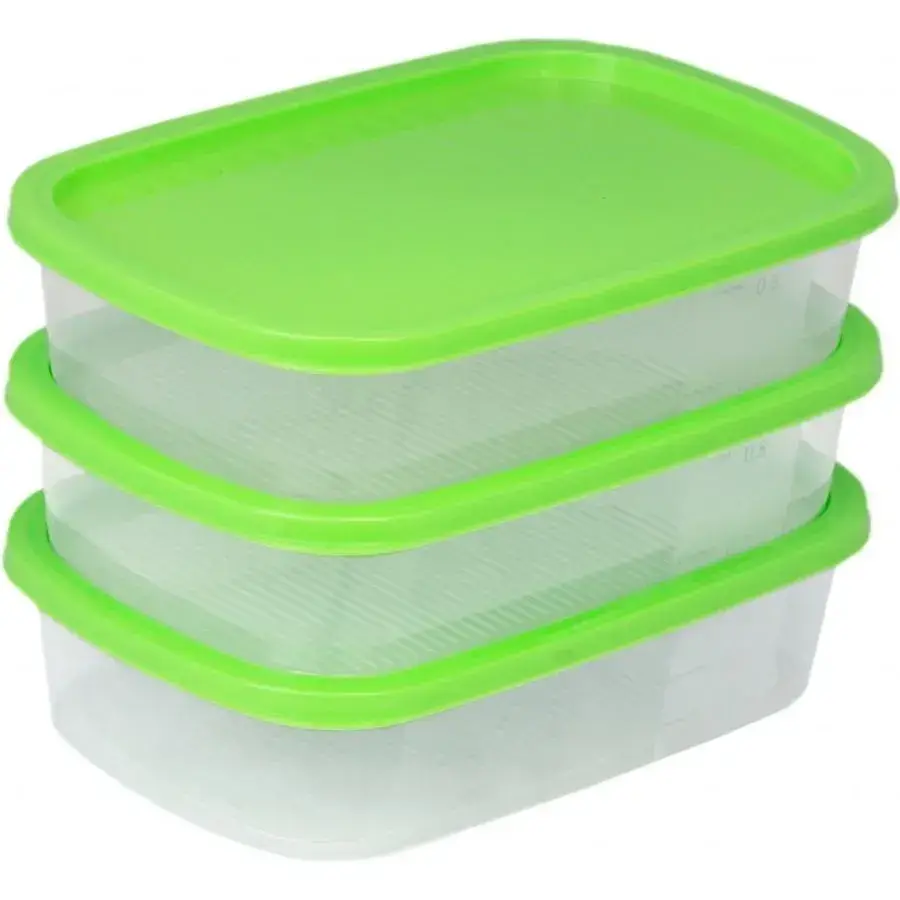 Набор прямоугольных контейнеров 3 шт, 1 л, прозрачные с зелеными крышками, герметичные