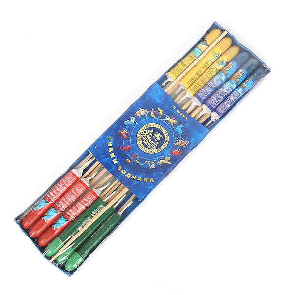Каждый фейерверк имеет длину 41 см, ширину 2 см и высоту 11 см. Корпус выполнен из картона, а основа — из дерева, что обеспечивает стабильность при запуске. Упаковка оформлена в ярких цветах и содержит изображения знаков зодиака, что делает ее привлекательной для покупателей.