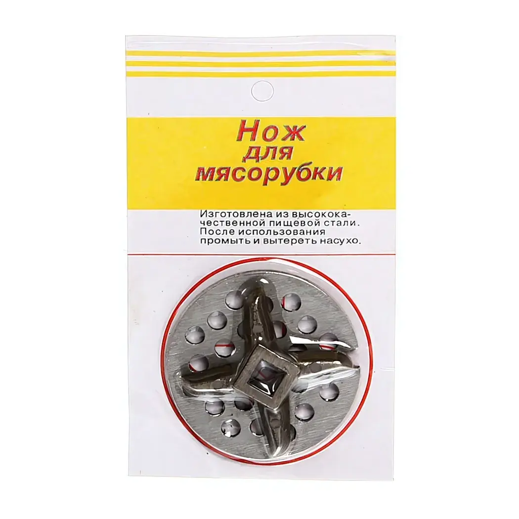 Нож имеет круглую форму с четырьмя лопастями и отверстиями, что обеспечивает эффективное измельчение. Он подходит для большинства стандартных мясорубок, что делает его универсальным решением для любой кухни. После использования просто промойте нож и вытерите насухо, чтобы продлить срок службы.