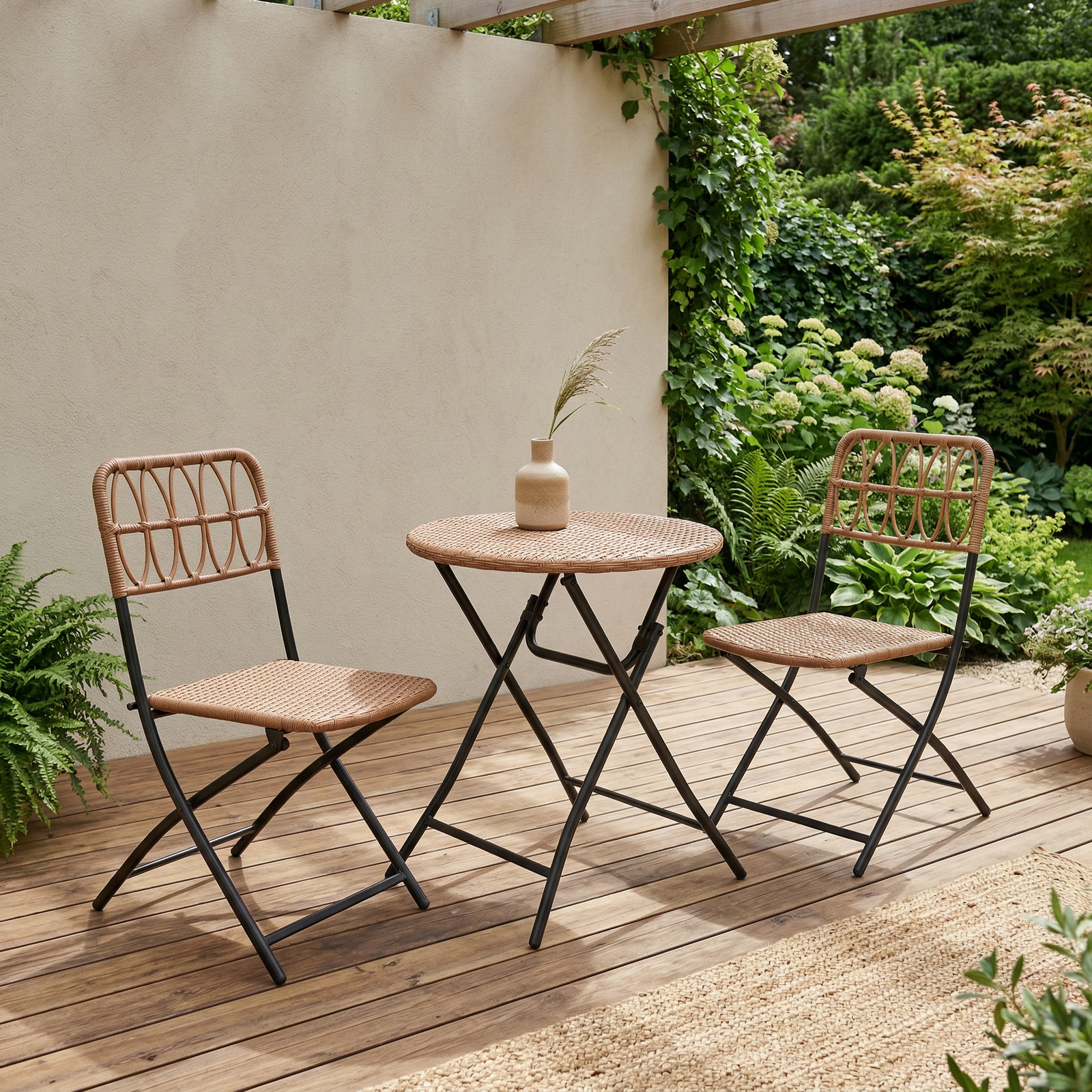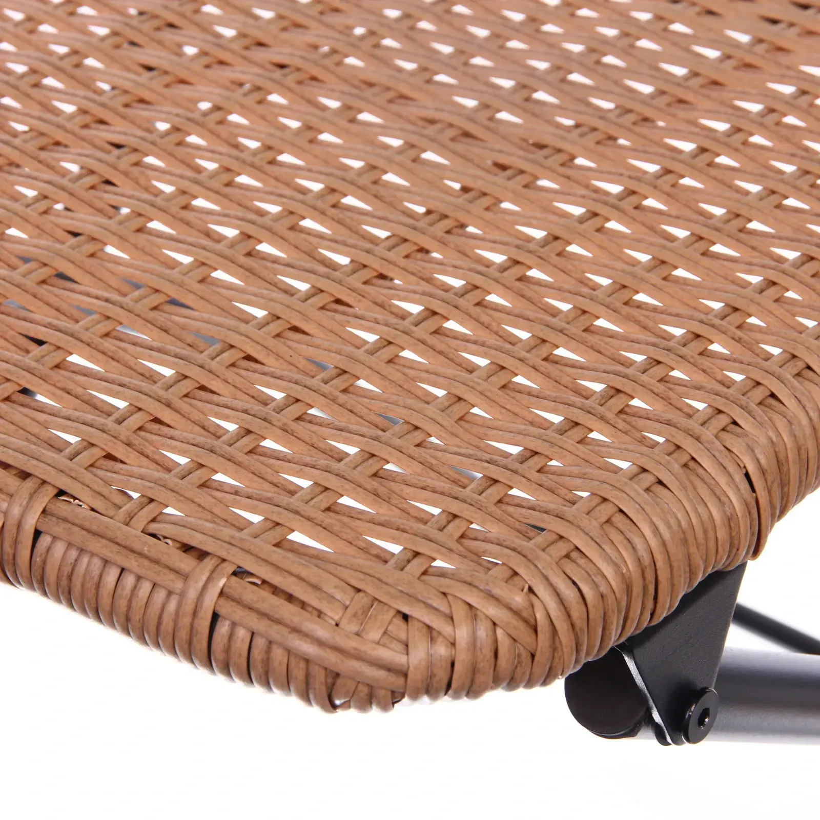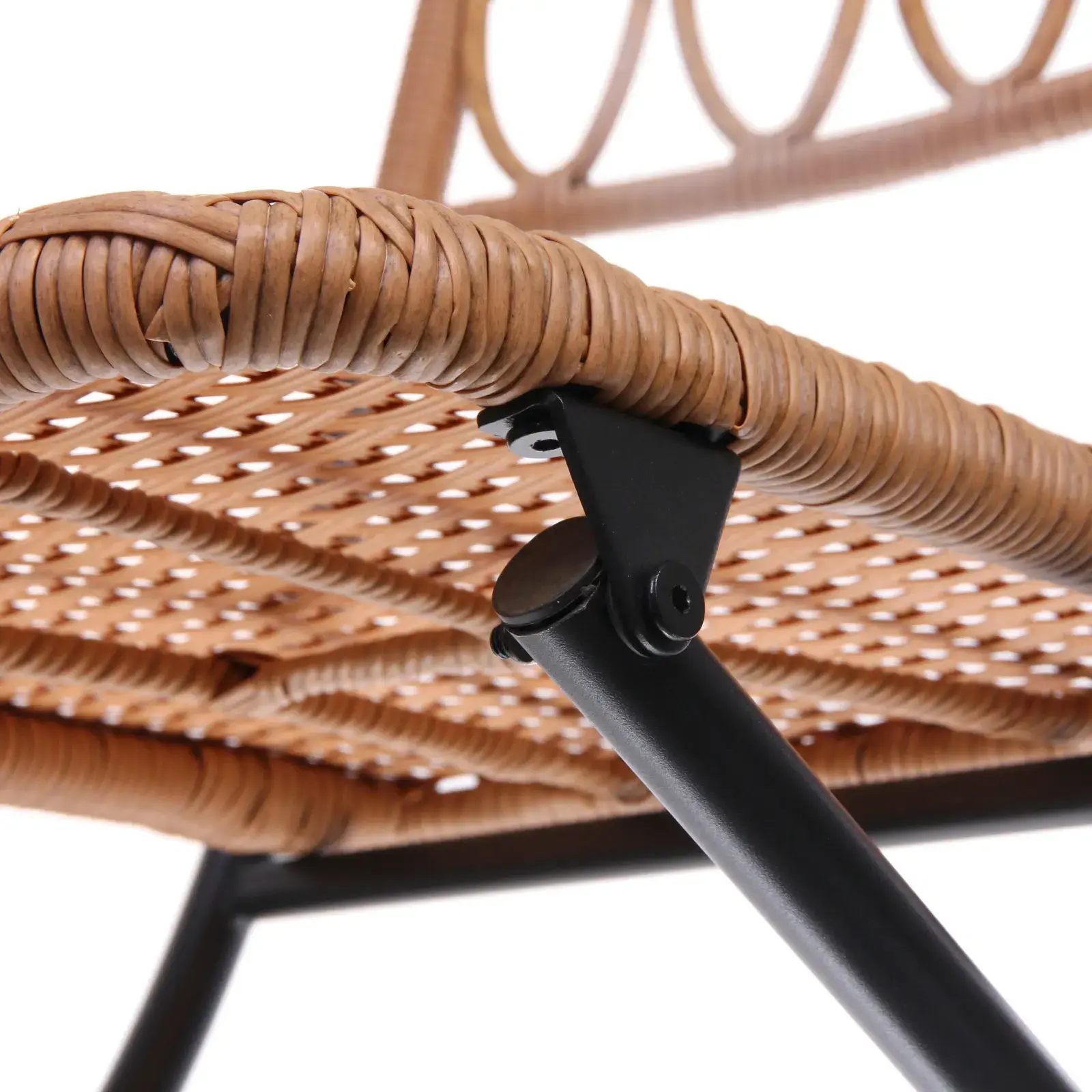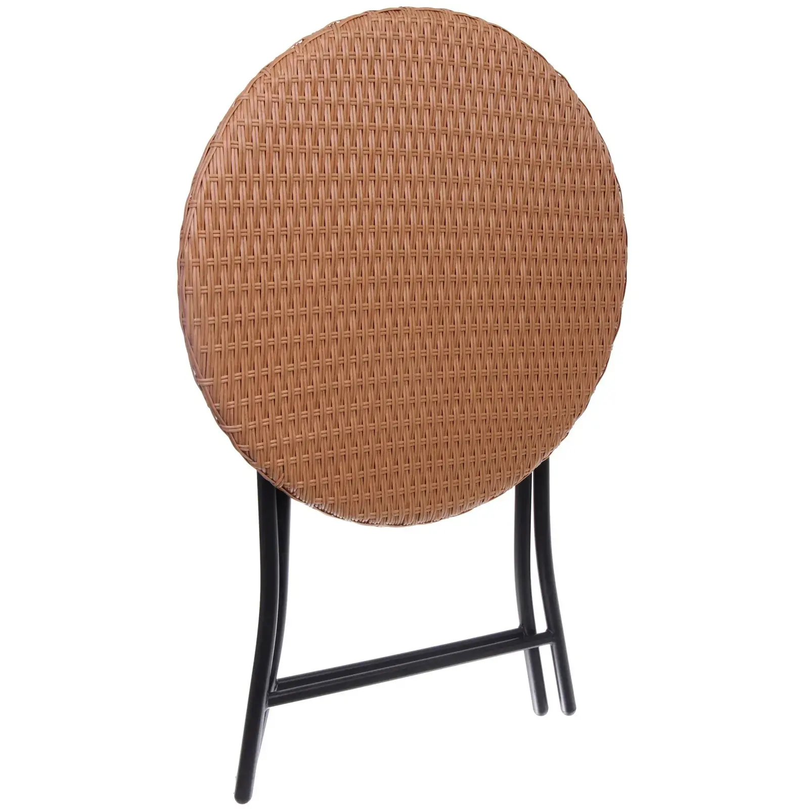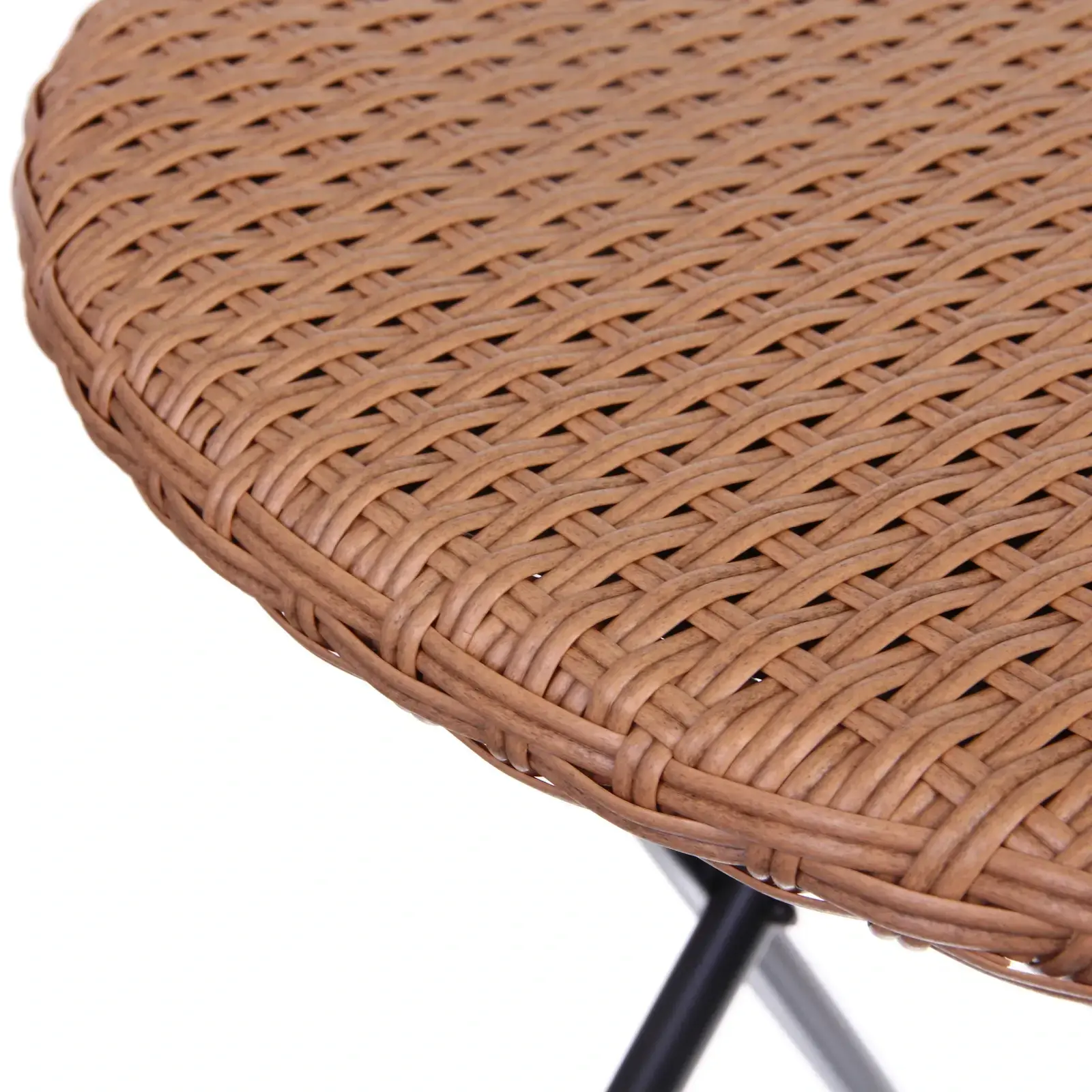 Металлопластиковая сборка сочетает легкость и устойчивость к коррозии. Складной механизм позволяет хранить комплект в сложенном виде, занимая минимальное пространство. Плетеная поверхность столешницы и сидений не нагревается на солнце, сохраняя приятную текстуру.
