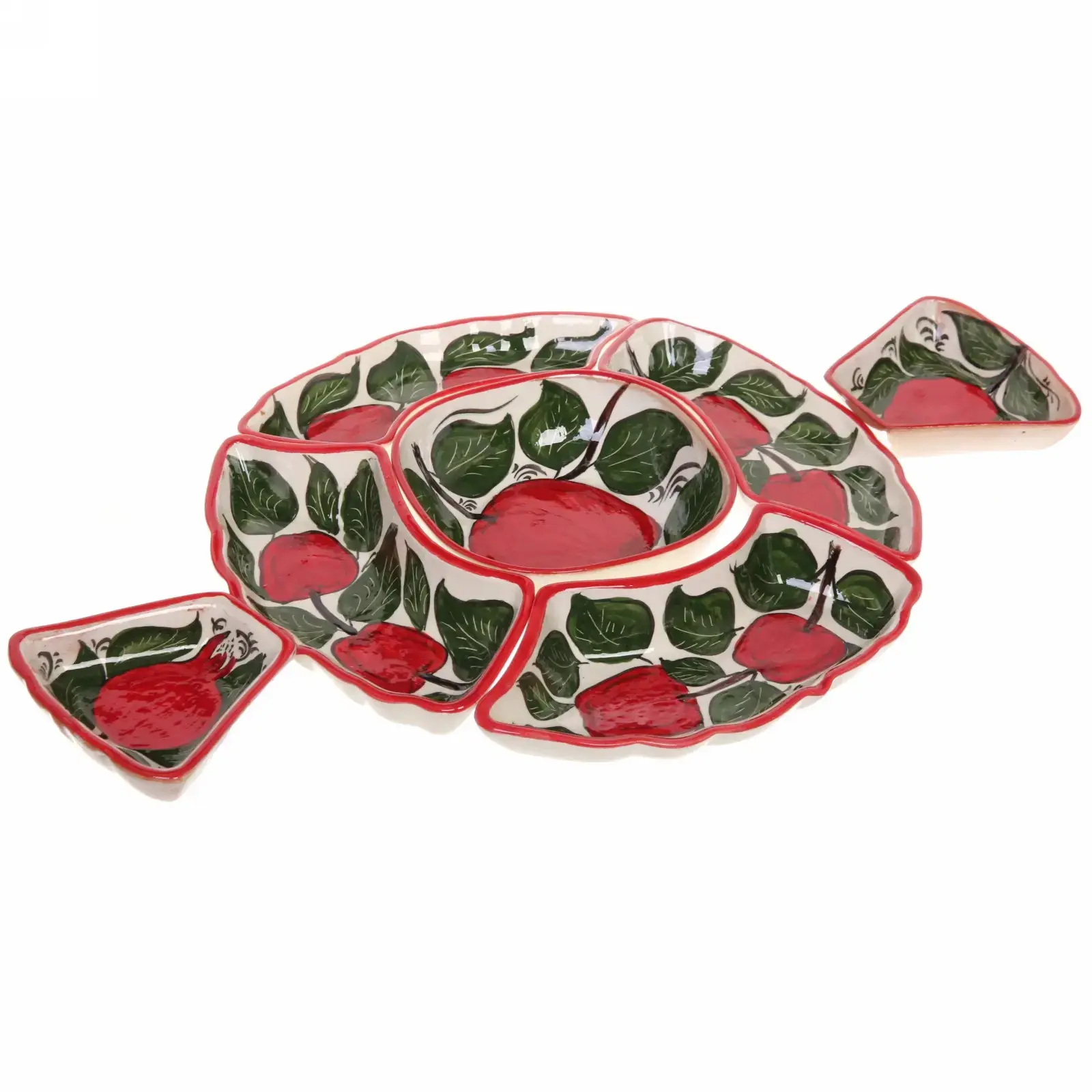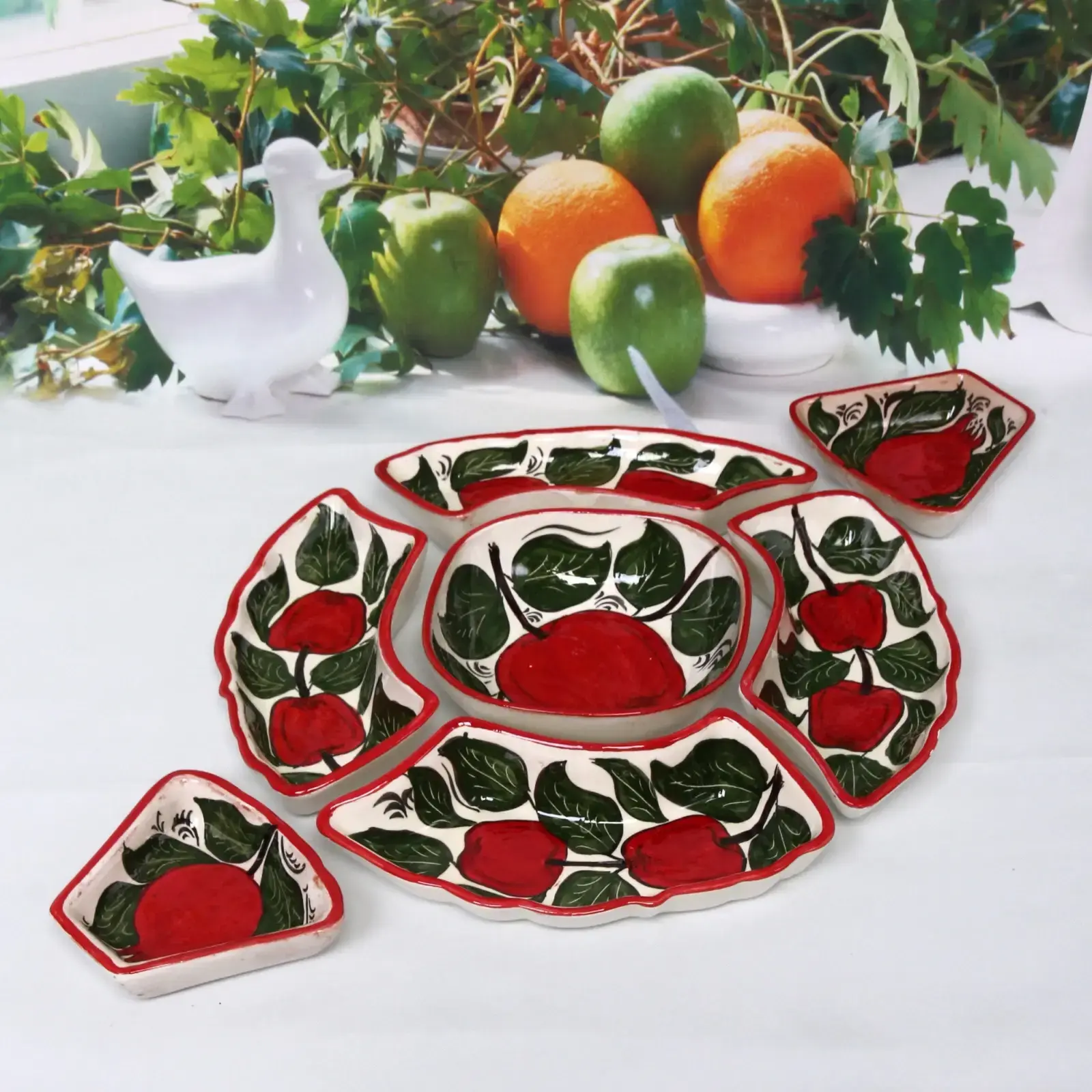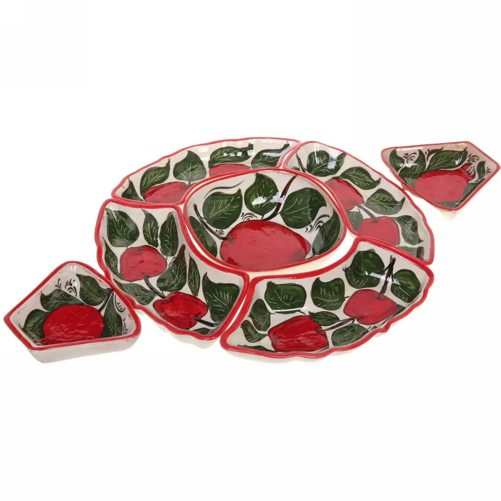 Набор из 7 керамических салатников превратит подачу блюд в искусство. Яркая роспись с сочными яблоками и изящными листьями создаст праздничное настроение, а разнообразие форм подчеркнет индивидуальность каждого угощения.