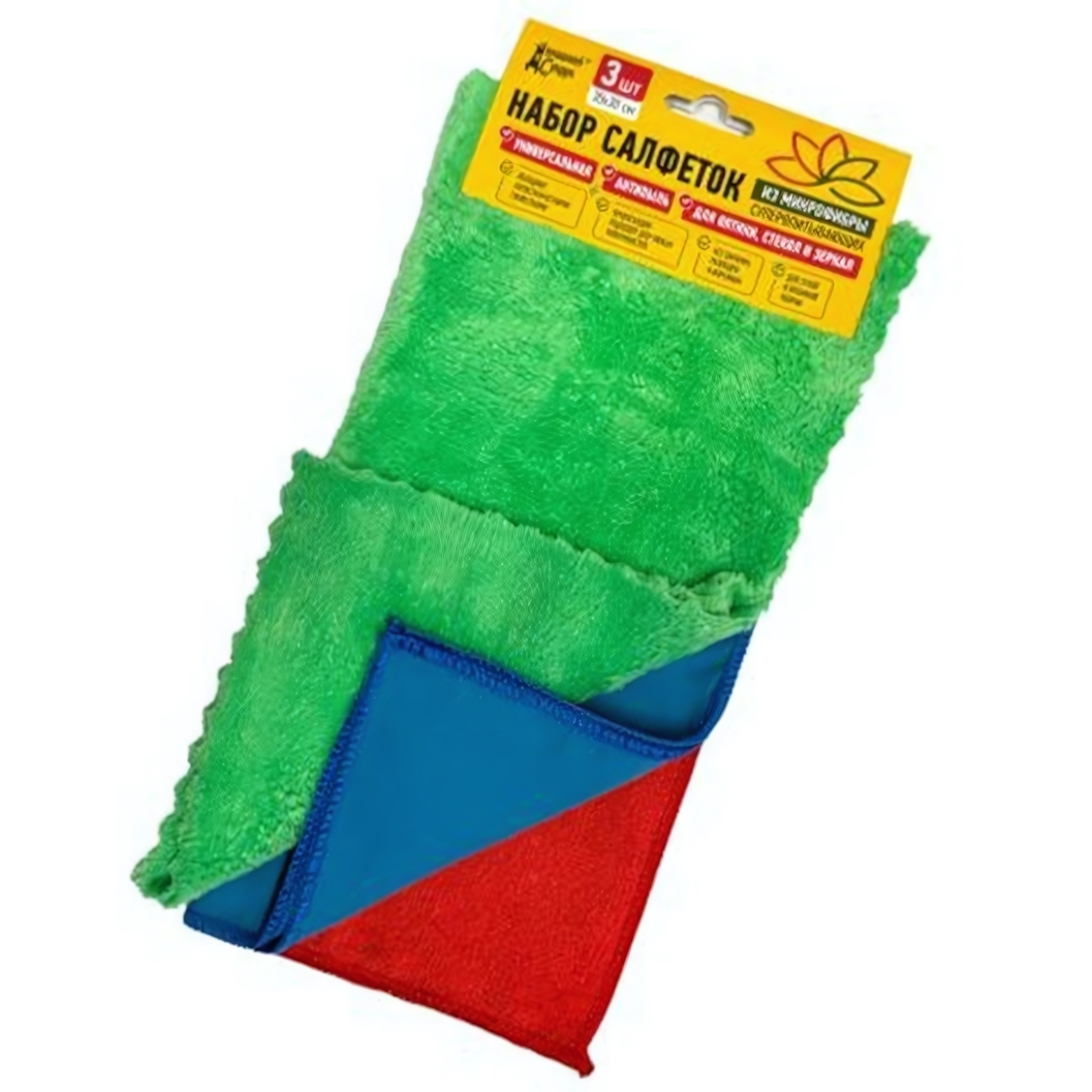 Размер каждой салфетки — 25х30 см, что удобно для обработки как небольших деталей, так и крупных поверхностей. В набор входит 3 шт, каждая имеет свою функциональность, что делает комплект универсальным помощником в доме. Салфетки легко стираются и сохраняют свои свойства при регулярном использовании.
