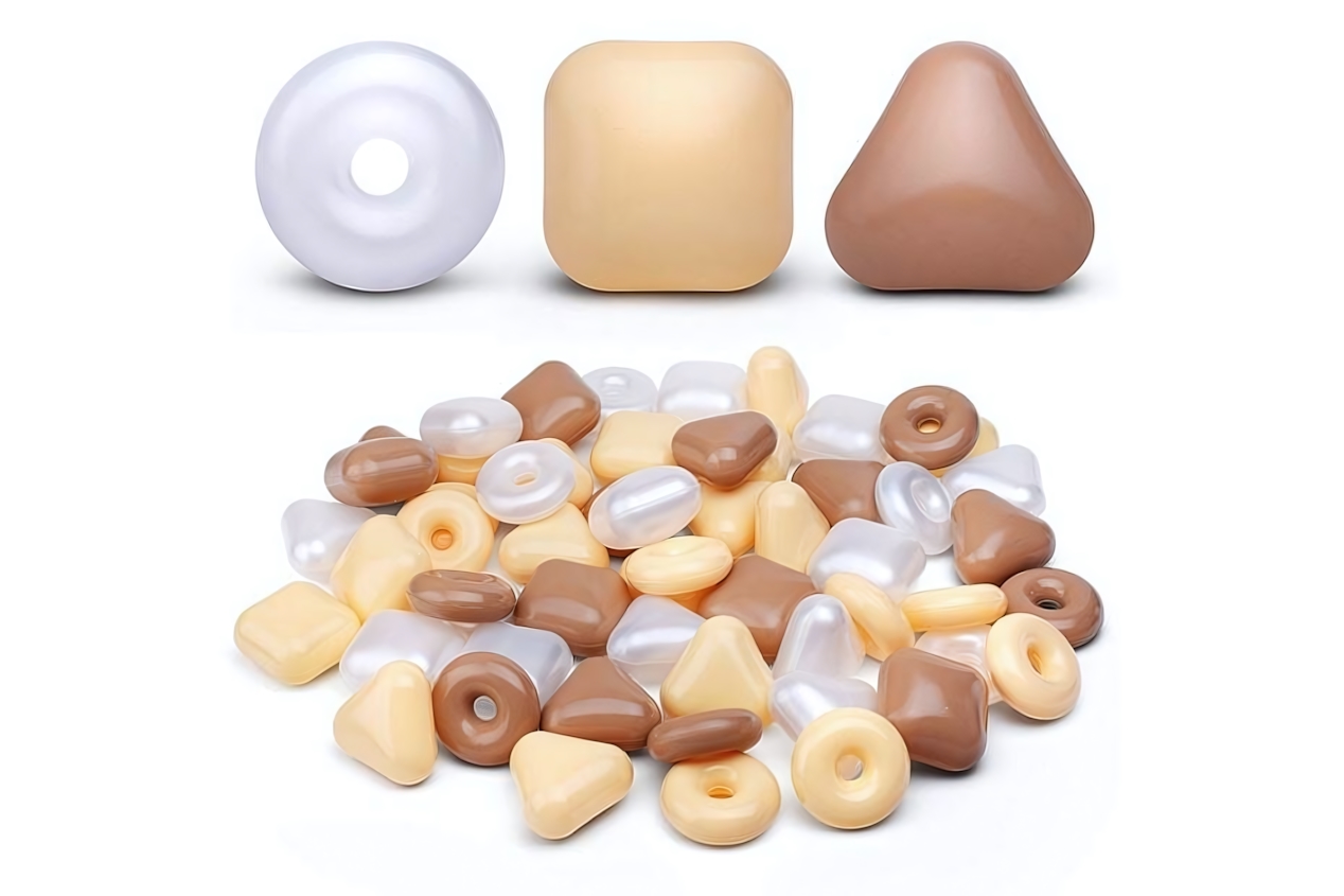 В наборе 50 шт. шариков разных геометрических форм (круг, квадрат, треугольник и др.). Каждый шарик имеет отверстие, что позволяет использовать их в комбинациях с шнурком для создания цветных гирлянд. Упаковка компактна (примерно 30 × 10 × 40 см), что облегчает хранение и транспортировку.