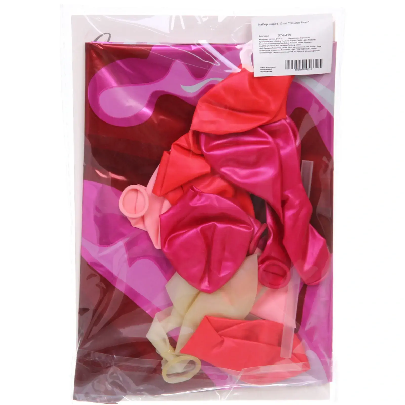 В набор входят 13 шаров различных форм и цветов: красные, розовые, прозрачные с конфетти и блестящие. Размеры шаров стандартные, что делает их универсальными для использования. Упаковка оформлена в светлых тонах с блестящими элементами, что подчеркивает праздничный вид. Не упустите возможность сделать ваш праздник ярче и веселее с набором шаров «Поцелуйчик»!