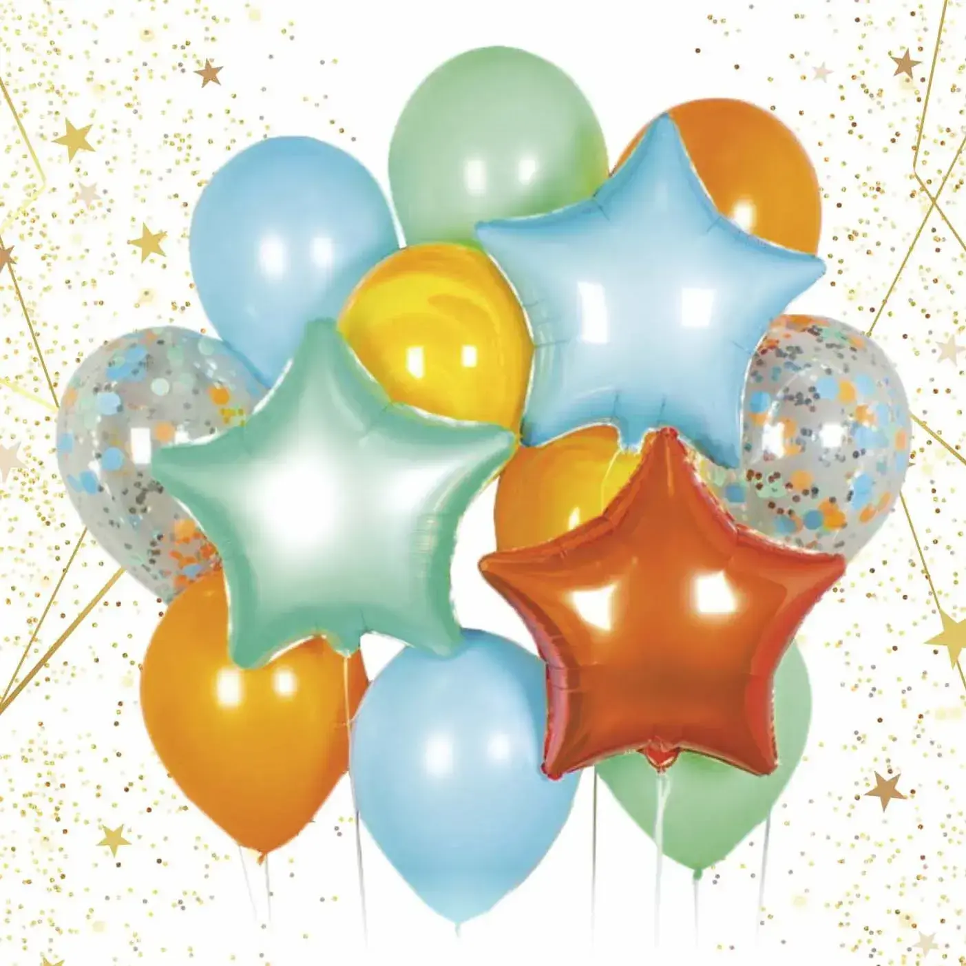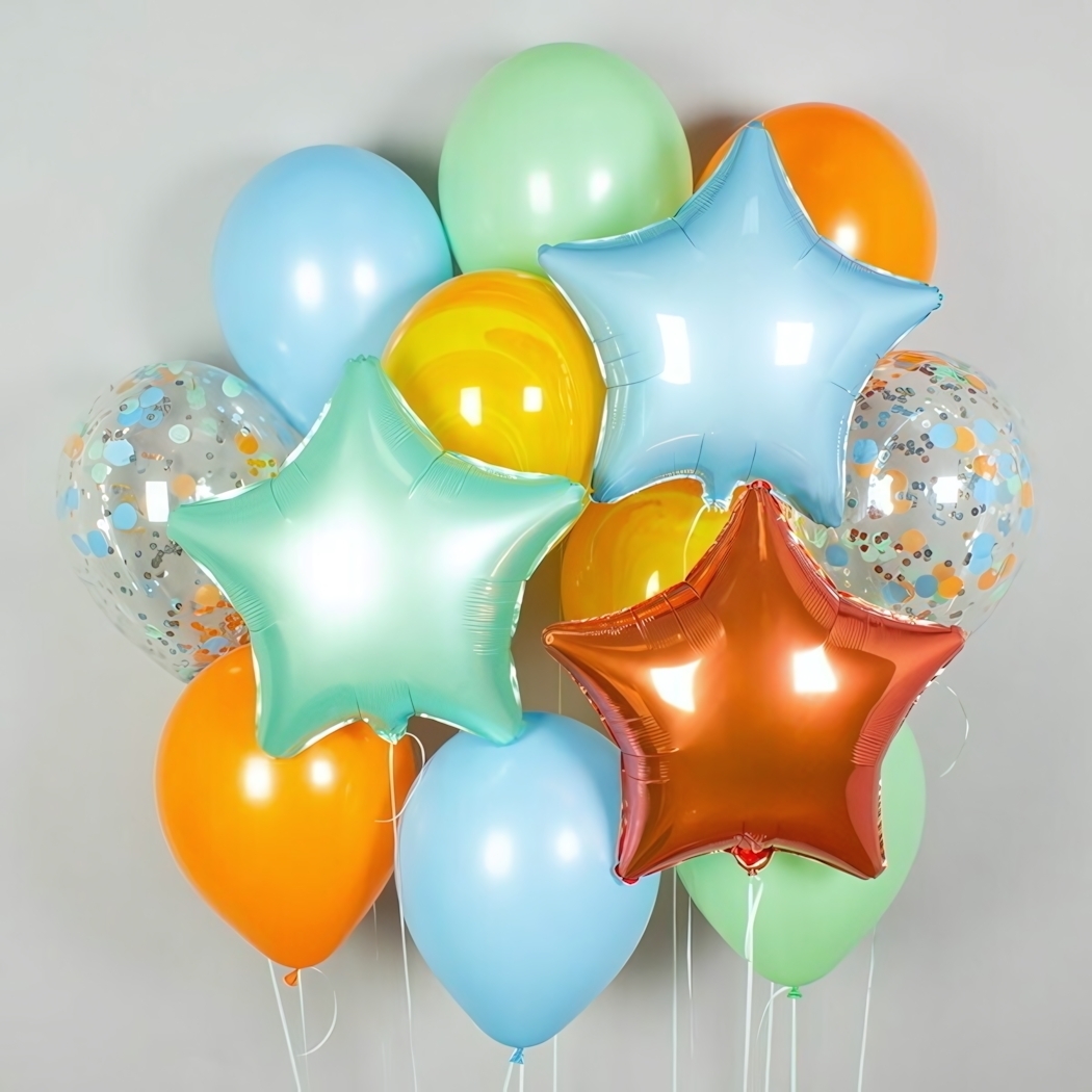 Шары в наборе представлены в различных формах: круглые и звёздные, что позволяет вам проявить креативность в оформлении. Их можно использовать как для создания букетов, так и для оформления фотозон. Шары легко надуваются и могут быть наполнены воздухом или гелием, что позволяет им плавать. Долговечные и надежные, они сохранят свою форму на протяжении всего праздника.