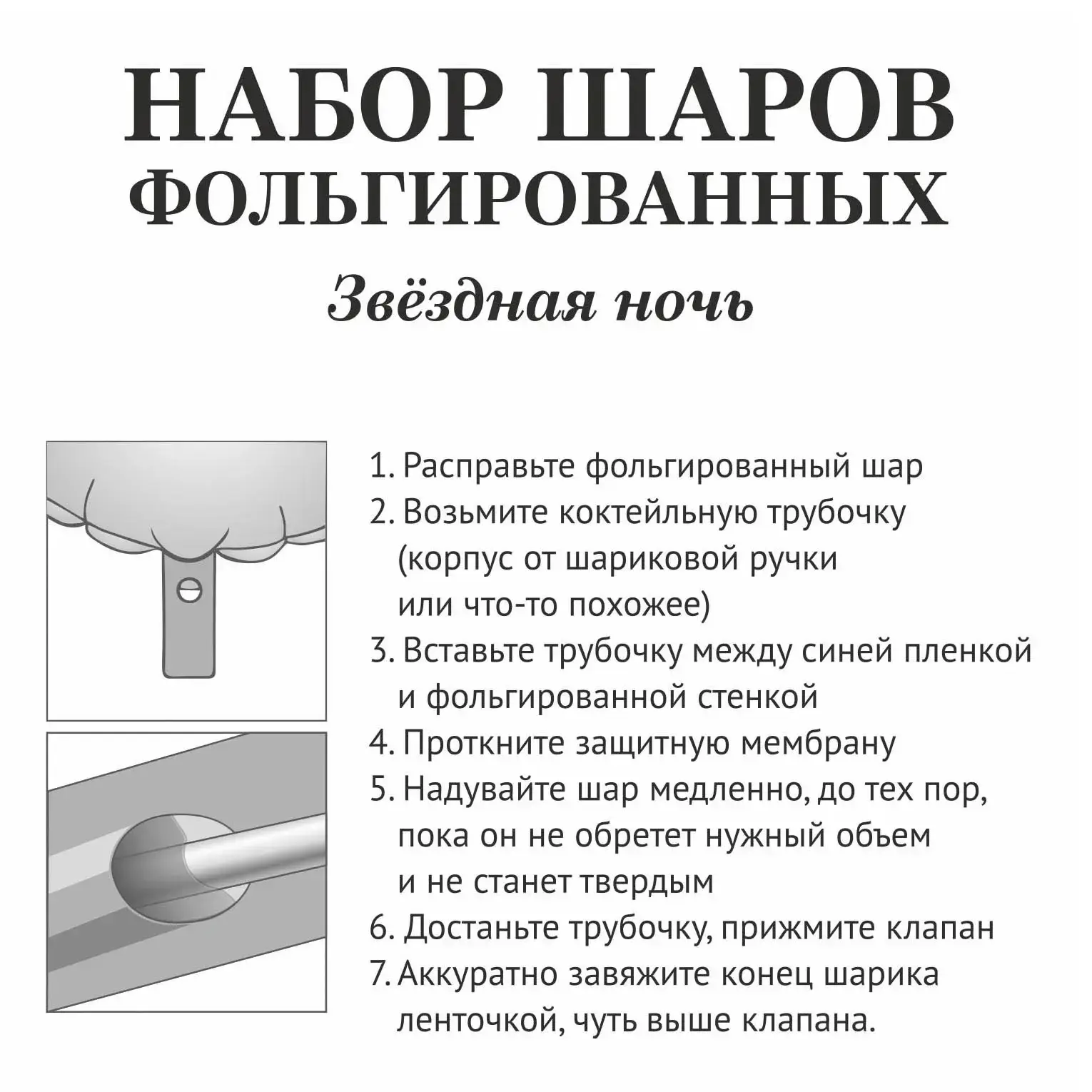 Комплектация: 13 шаров из латекса и фольги. Цветовая гамма включает металлический синий, серебристый, розовый и кремовый оттенки. Производитель предусмотрел инструкцию по надуванию, гарантирующую правильную подготовку каждого шара.