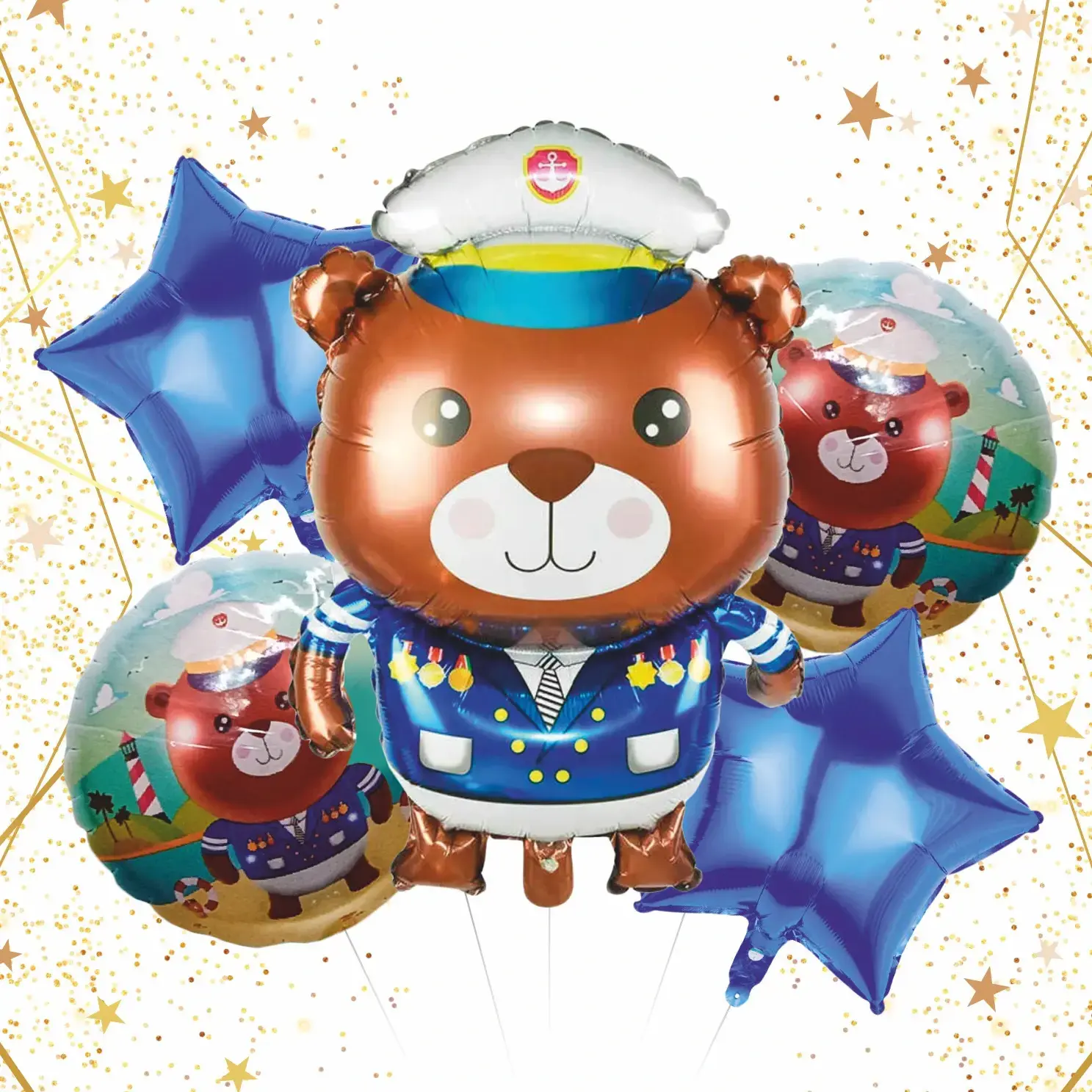 Набор включает 5 шаров, среди которых один шар в форме медвежонка в морской форме и два круглых шара с изображением медведя на фоне живописного пейзажа. Также в комплект входят два звёздных шара насыщенного синего цвета. Эти шары легко надуваются и могут использоваться как декор для праздника или как самостоятельный подарок.