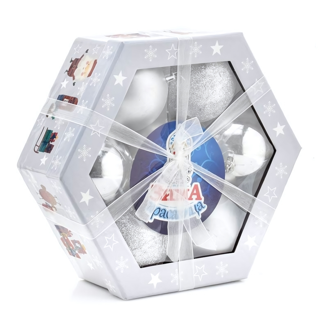 Диаметр каждого шара составляет 7 см, что делает их универсальными – они гармонично смотрятся как на большой пушистой ёлке, так и на компактной искусственной. Упаковка выполнена в светло-сером цвете с зимними узорами и прозрачным окном, перевязана органзовой лентой с аккуратным бантом, что позволяет использовать её не только для хранения, но и как подарочный вариант.