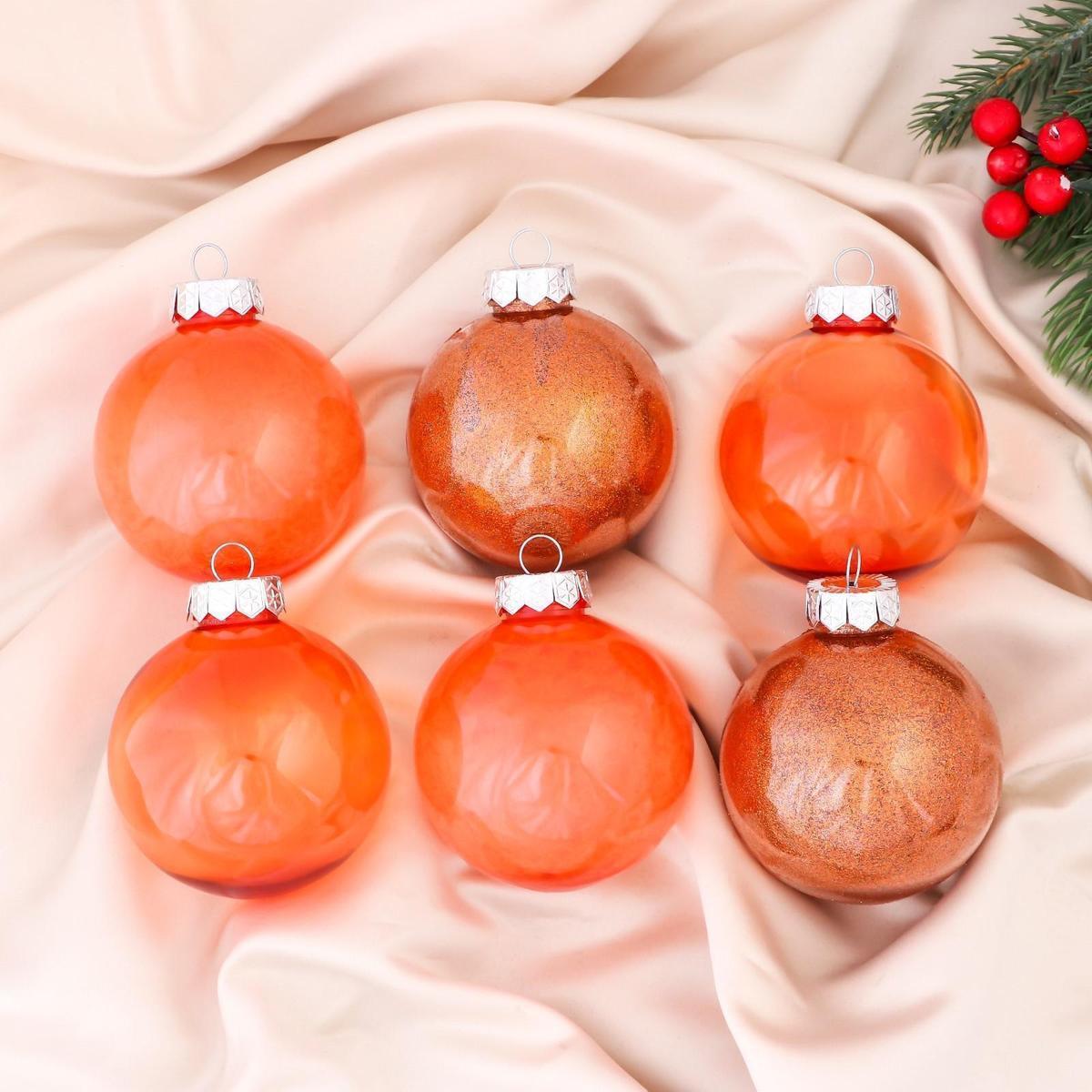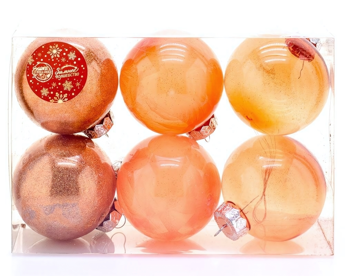 Диаметр: 8 см. Количество в наборе: 6 шт. Материал: пластик с декоративным покрытием. Отгружается именно набор из 6 одинаковых по размеру шаров, выполненных в различных вариациях оранжево-золотистой гаммы.