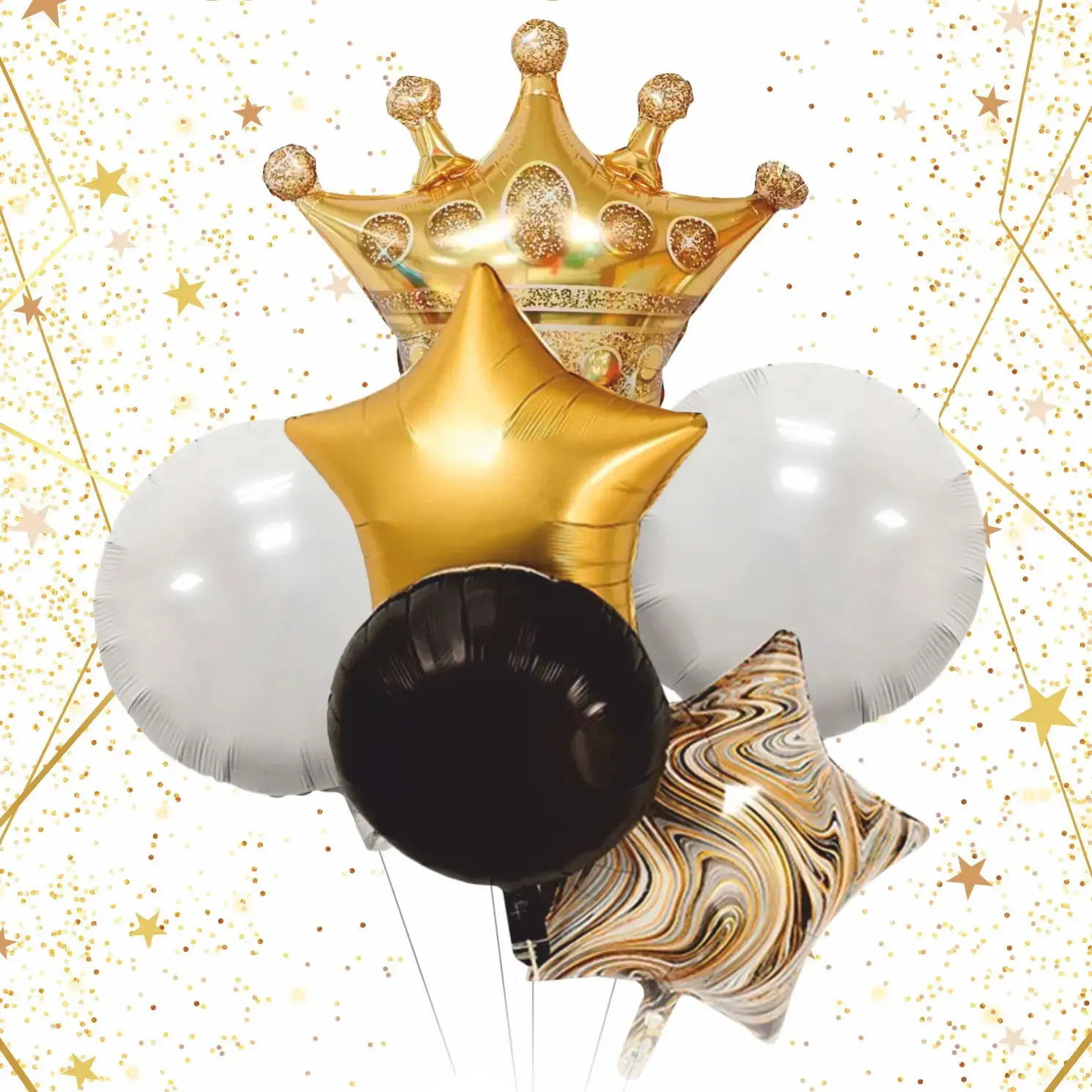 В набор входят 6 шаров различных форм и цветов: золотая корона, золотая звезда, черный шар, белый шар и шар с мраморным дизайном. Каждый шар выполнен из качественного латекса и фольги, что обеспечивает их долговечность и яркость. Шары легко надуваются и могут использоваться как для декора, так и для игр на празднике.