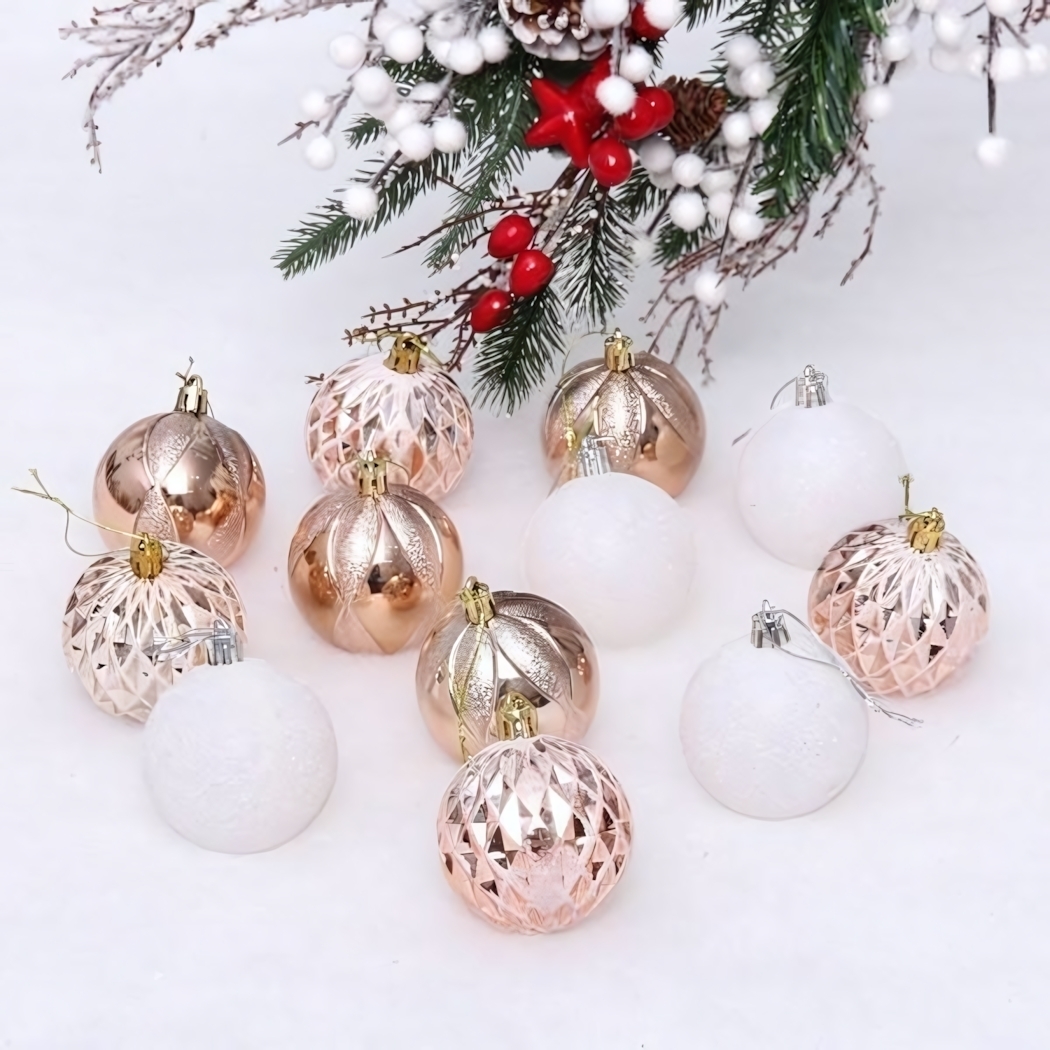 Каждый шар имеет диаметр 6 см, набор включает 12 единиц. Цветовая палитра: шампань, белый, розовый, золотой. Материал – прочный пластик, безопасный для детей.