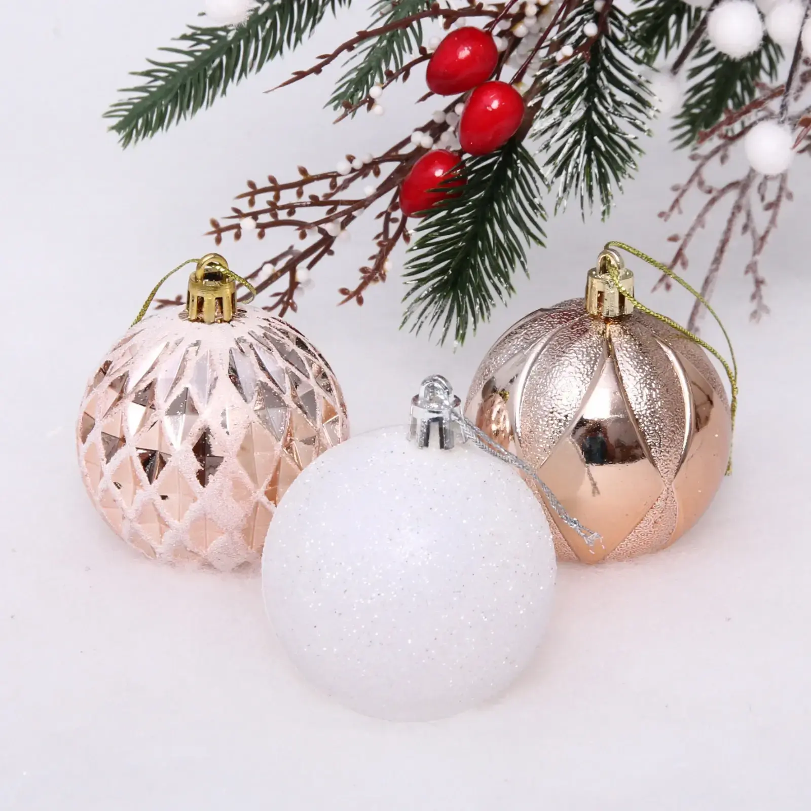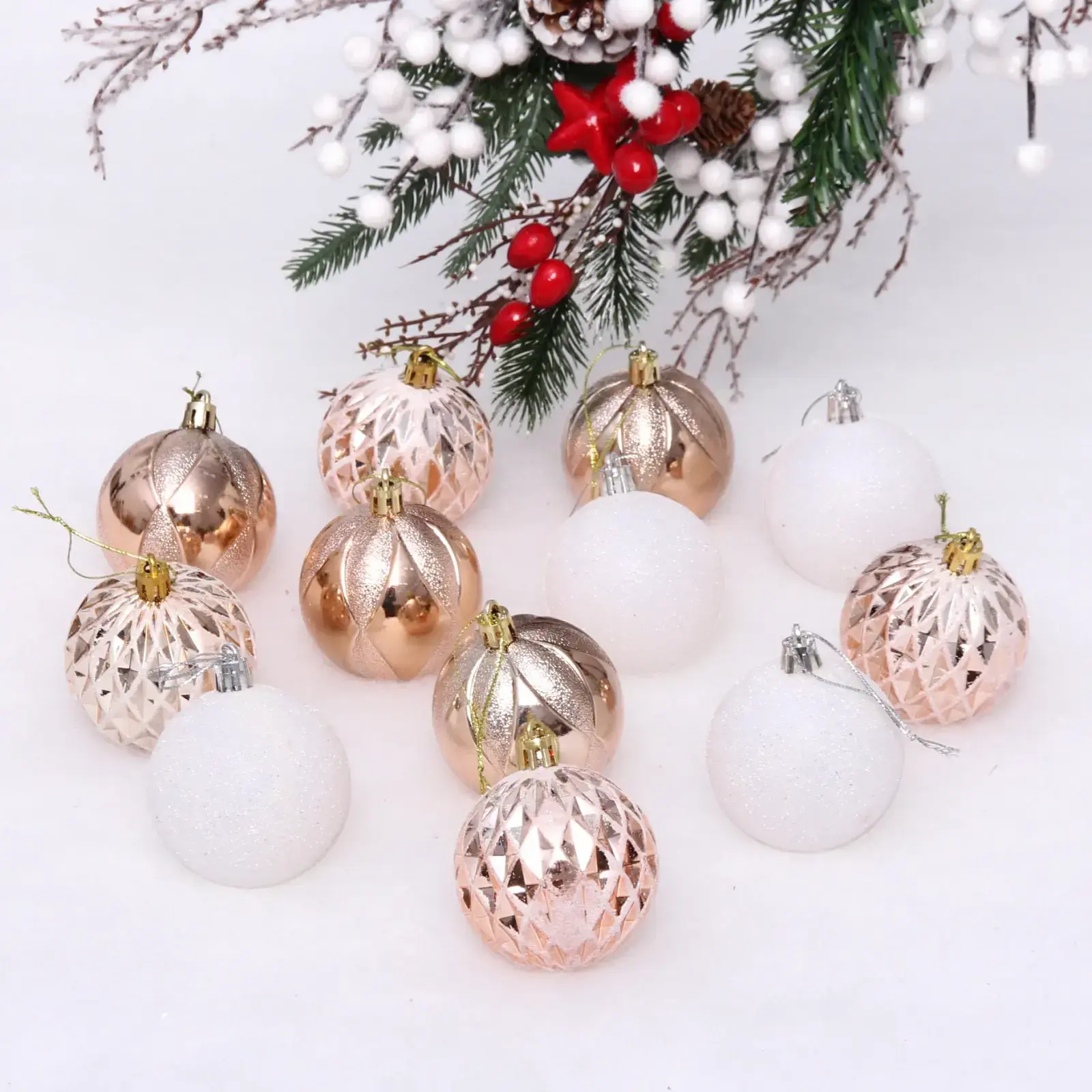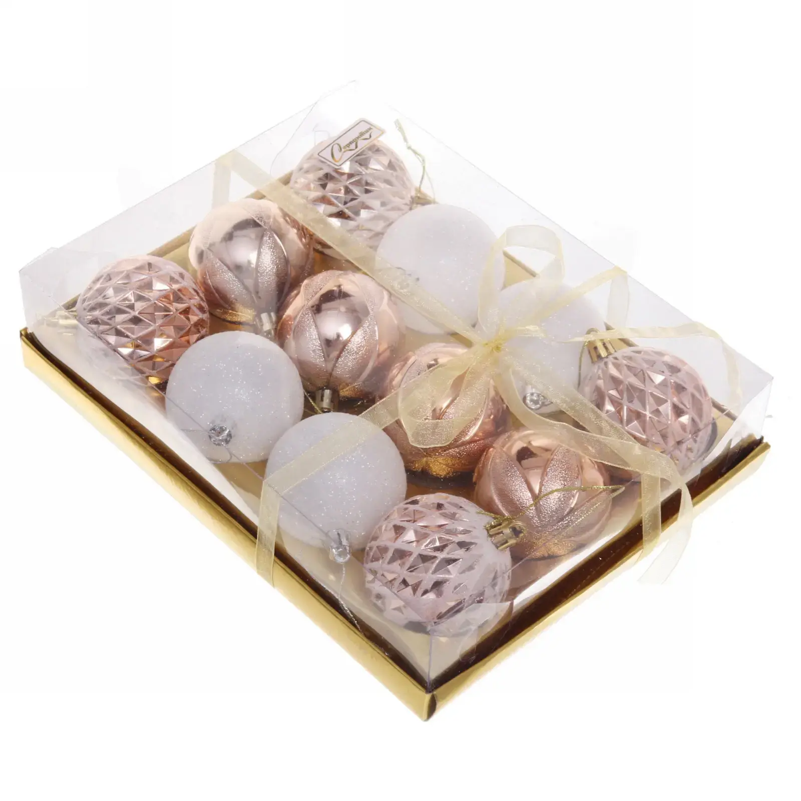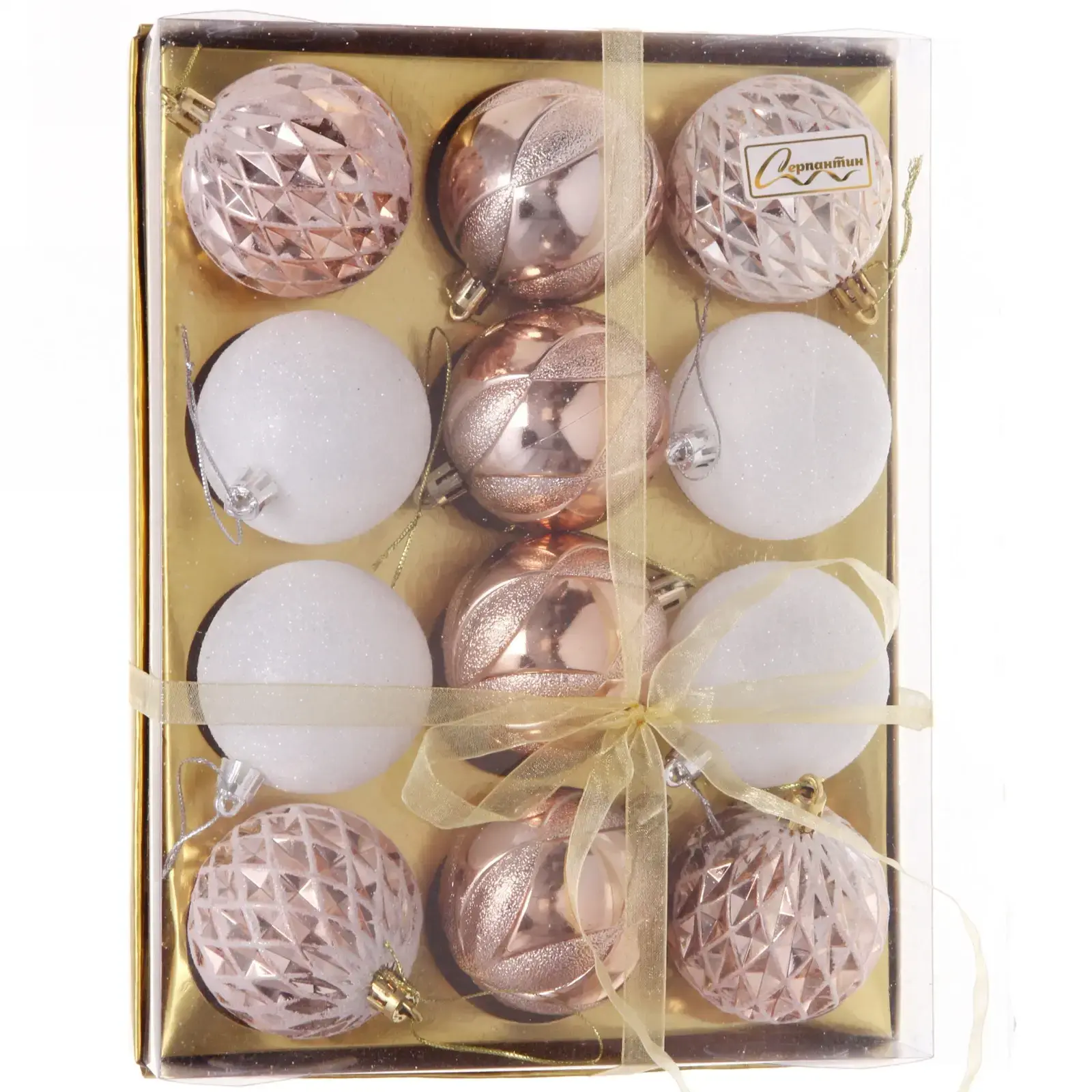 Набор из 12 элегантных шаров для создания гармоничного новогоднего декора. Сочетание нежных оттенков шампаня и белого добавит вашей ёлке изысканности, а разнообразие текстур создаст эффект мерцания в свете гирлянд.