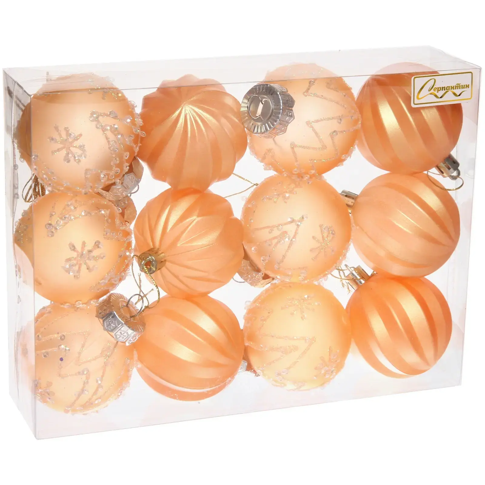 Объем набора — 12 штук, диаметр шаров — 6 см, материал — пластик, цвет — янтарь, светло-оранжевый и золотисто-персиковый. Такой ассортимент позволяет быстро и красиво оформить любую новогоднюю композицию или елку без дополнительных затрат и хлопот.