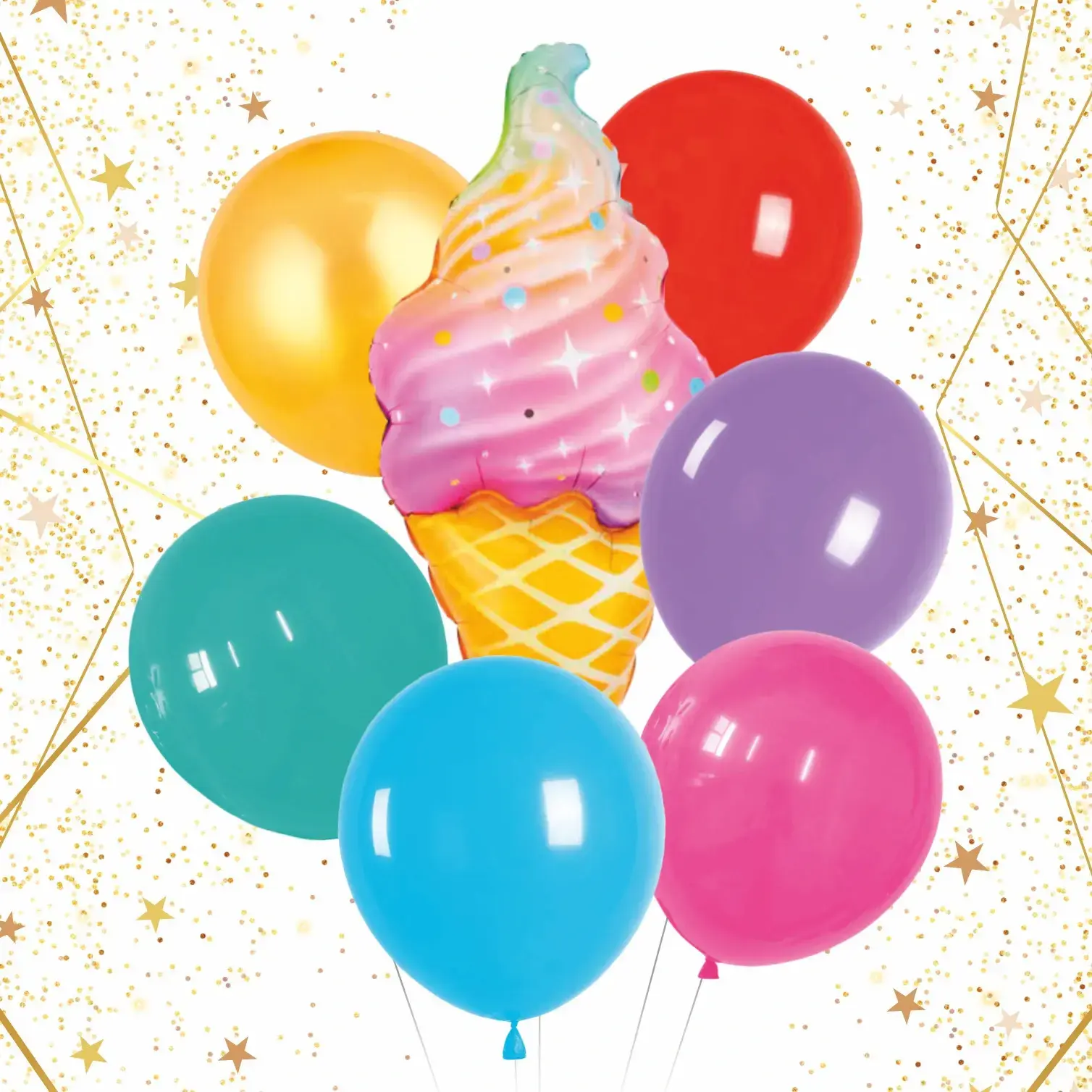 Шары легко надуваются и могут использоваться как для декора, так и для игр. В набор входят 7 шаров, среди которых особое внимание привлекает шар в форме мороженого. Он выполнен в пастельных тонах и станет центральным элементом вашего праздника. Используйте шары для создания красивых композиций, гирлянд или просто для украшения помещения.