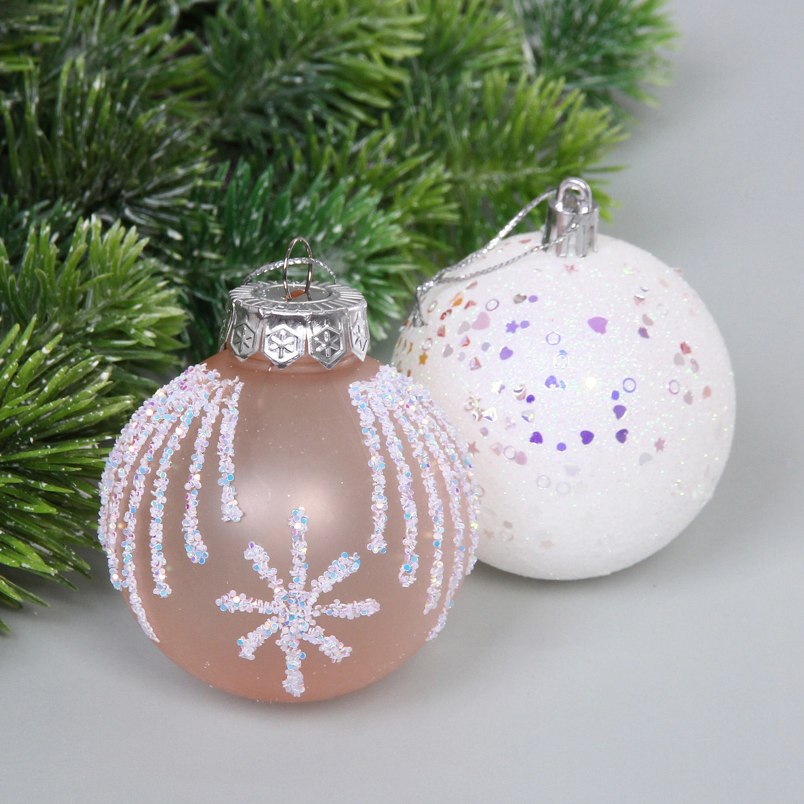 Шары диаметром 7 см — классический и универсальный размер, который отлично смотрится как на больших, так и на компактных искусственных или живых ёлках. Два нежных оттенка — янтарный и белый — создают элегантное и тёплое сочетание, которое подходит к любому интерьеру. Поверхность каждого шара покрыта блёстками, а на некоторых нанесён изящный узор из мерцающих полос, точек и фигурок (сердечки, звёздочки), что придаёт украшениям дополнительный объём и игру света.