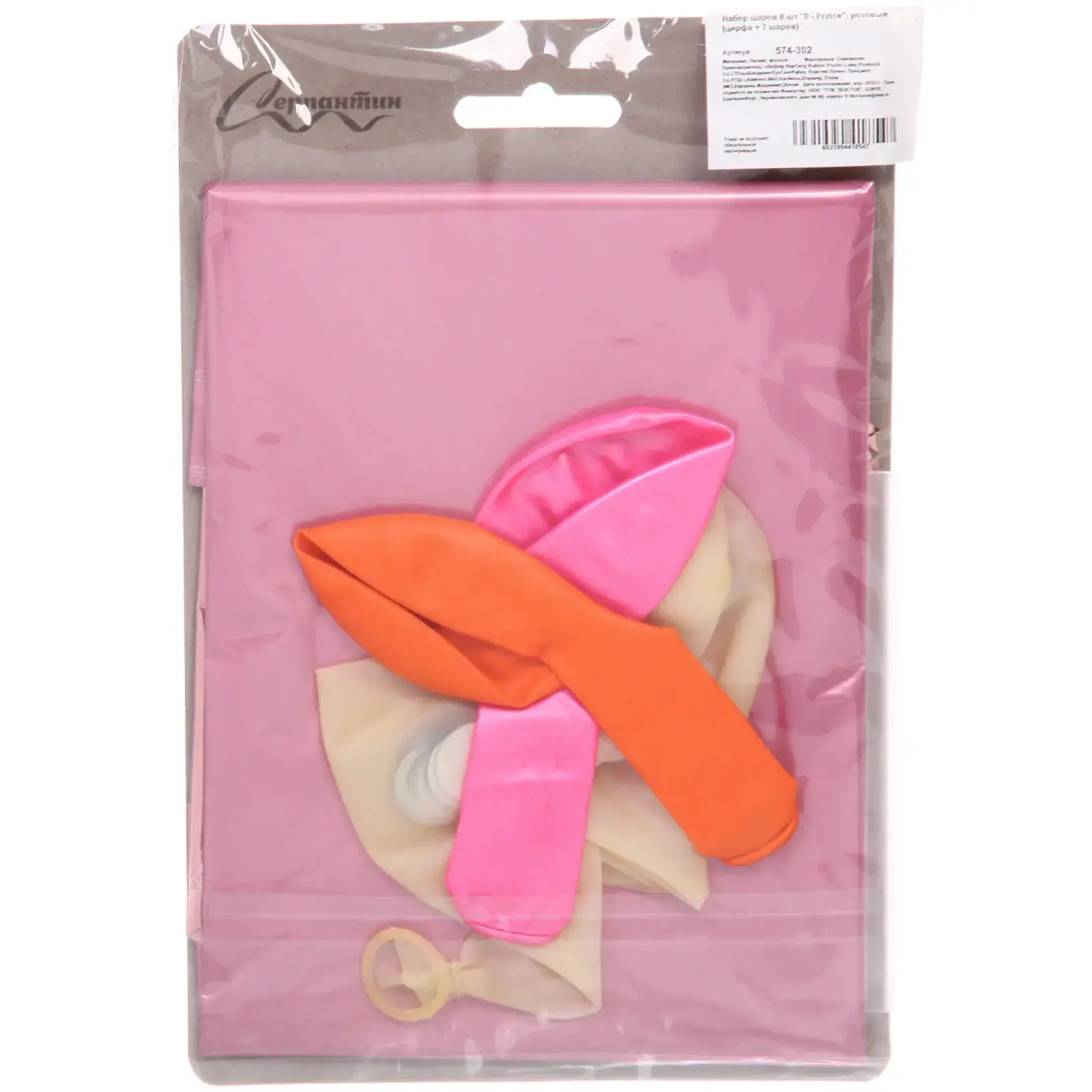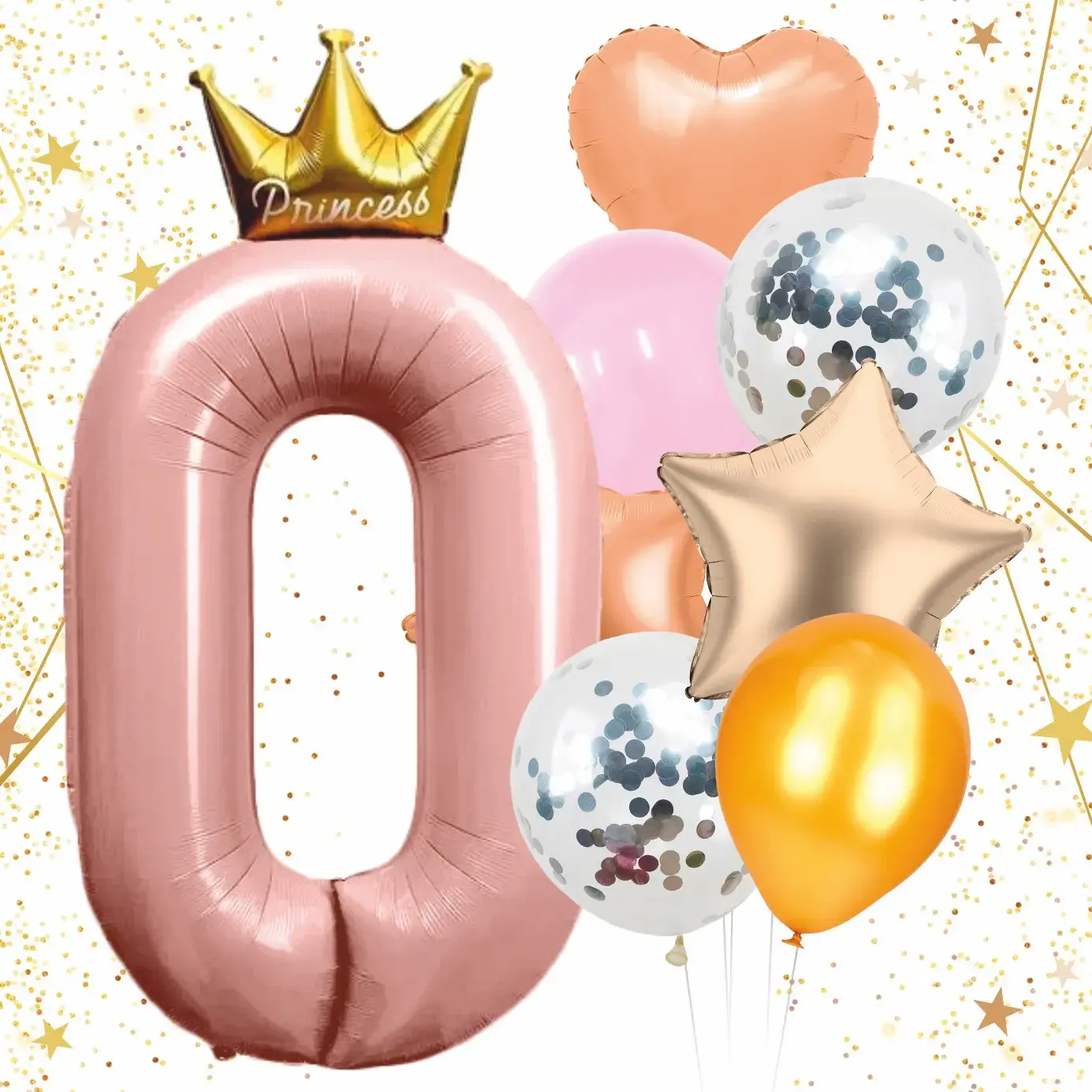 В набор входят 8 шаров, включая шар в форме сердца, прозрачный шар с конфетти и золотой шар. Все шары имеют глянцевую текстуру и выглядят наполненными воздухом или гелием. Размер шара «0» значительно крупнее остальных, что делает его центром внимания на любом празднике.