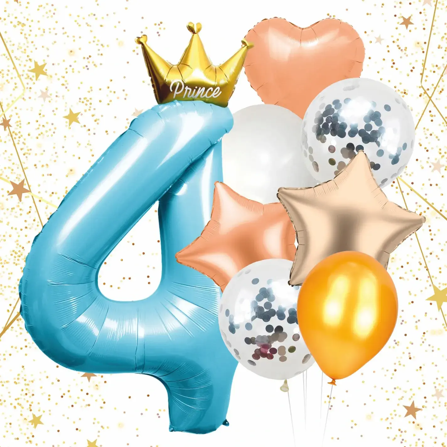 В набор входят 8 шаров, включая один большой фольгированный шар в форме цифры «4», а также шары в форме сердца и звезды различных цветов: голубого, золотого, белого и оранжевого. Размеры шаров не указаны, но они выглядят крупными и заметными. Используйте этот набор для создания волшебной атмосферы на вашем празднике!