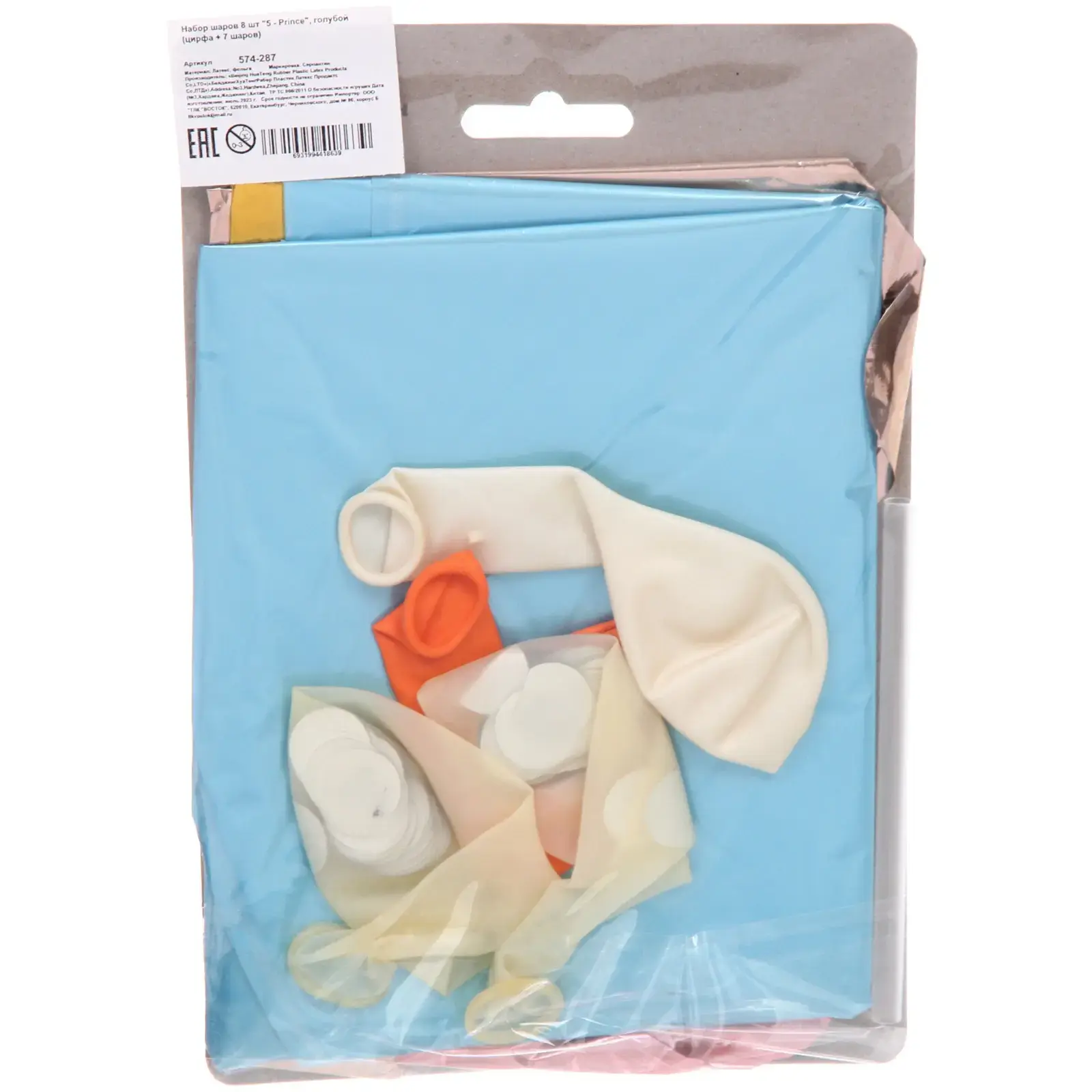 В набор входят 8 шаров, включая один большой шар в форме цифры «5» голубого цвета, а также круглые и звёздные шары в различных цветах: оранжевом, золотом, белом с блестками и розовом. Размеры шаров не указаны, но они выглядят достаточно большими и эффектными. Упаковка оформлена в ярких тонах, что делает её привлекательной для детей и взрослых.