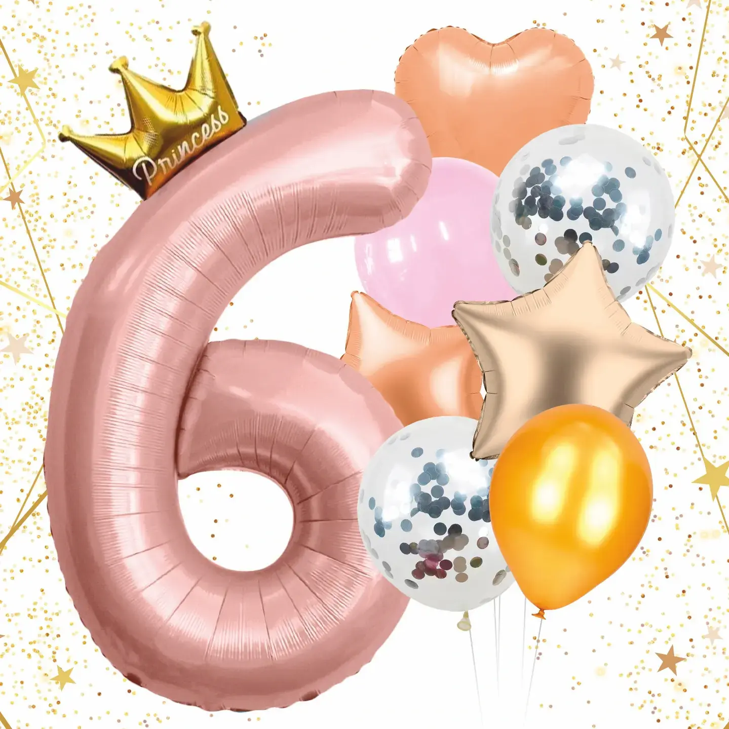 Шары легко надуваются и могут использоваться как для домашних праздников, так и для мероприятий на улице. Они подойдут для детей и взрослых, добавляя яркие акценты в любое событие. Набор включает в себя: один фольгированный шар в форме цифры 6, один шар в форме сердца, несколько шаров с блестками, один золотой шар и один прозрачный шар с конфетти.