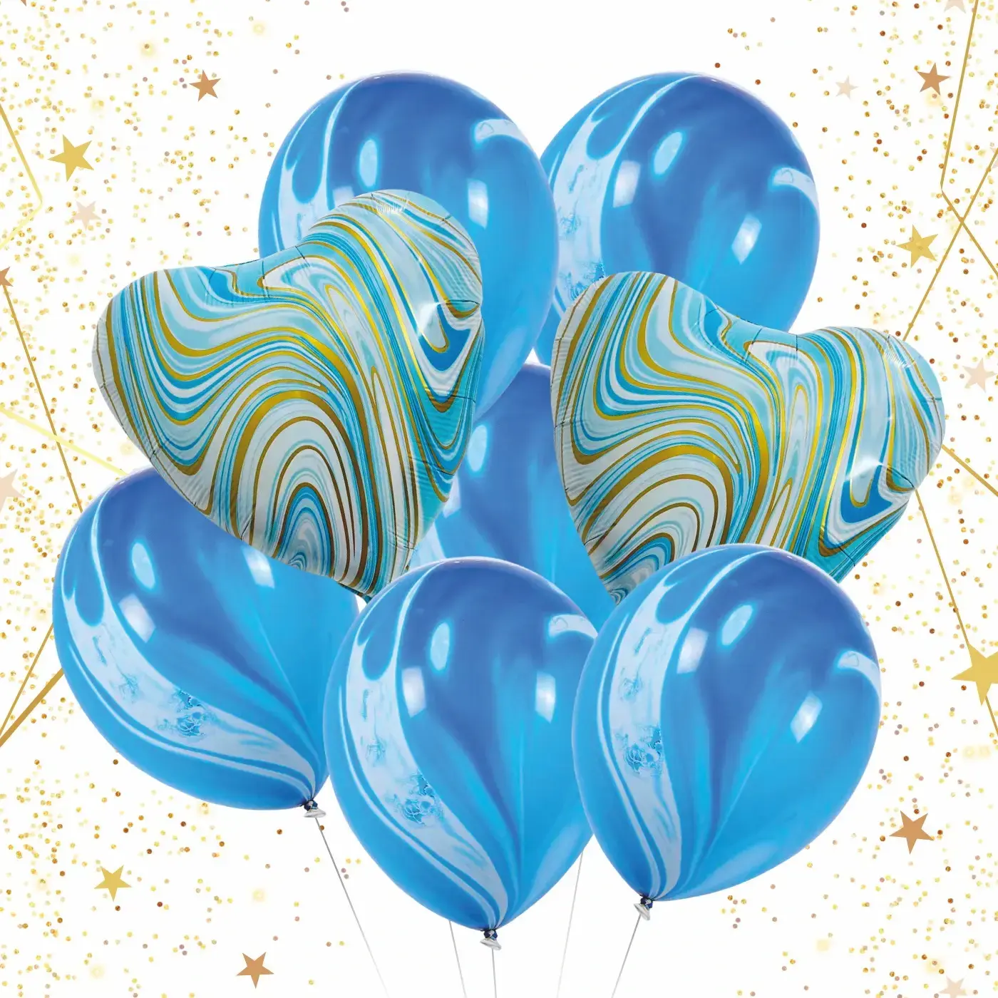 Шары имеют яркий голубой цвет с акварельными узорами, что делает их универсальными для любого праздника. Размеры шаров визуально выглядят средними, что позволяет использовать их как в помещениях, так и на улице. Упаковка оформлена в светлых тонах с золотыми блестками, что добавляет праздничного настроения.