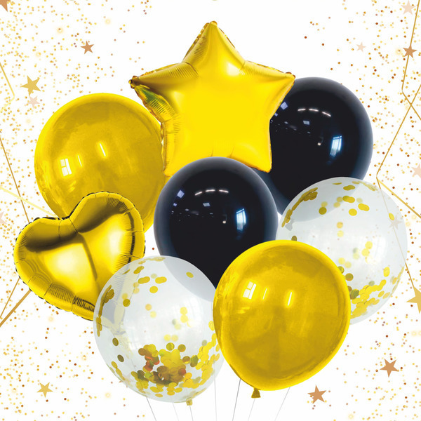 Набор состоит из 8 шаров различных форм и цветов: один звездный шар и одно сердце золотого цвета, черный шар, несколько прозрачных шаров с конфетти и один желтый шар. Эти шары идеально подходят для украшения помещений, создания фотозон и оформления праздничных столов. Они легко надуваются и могут использоваться как в помещении, так и на улице.
