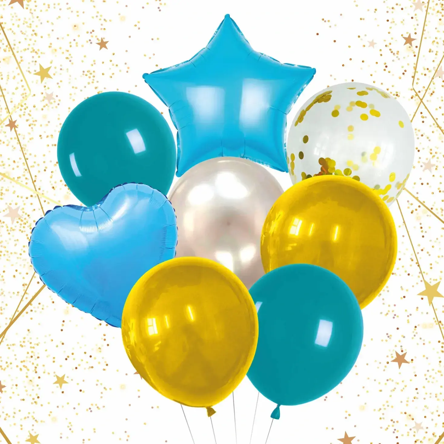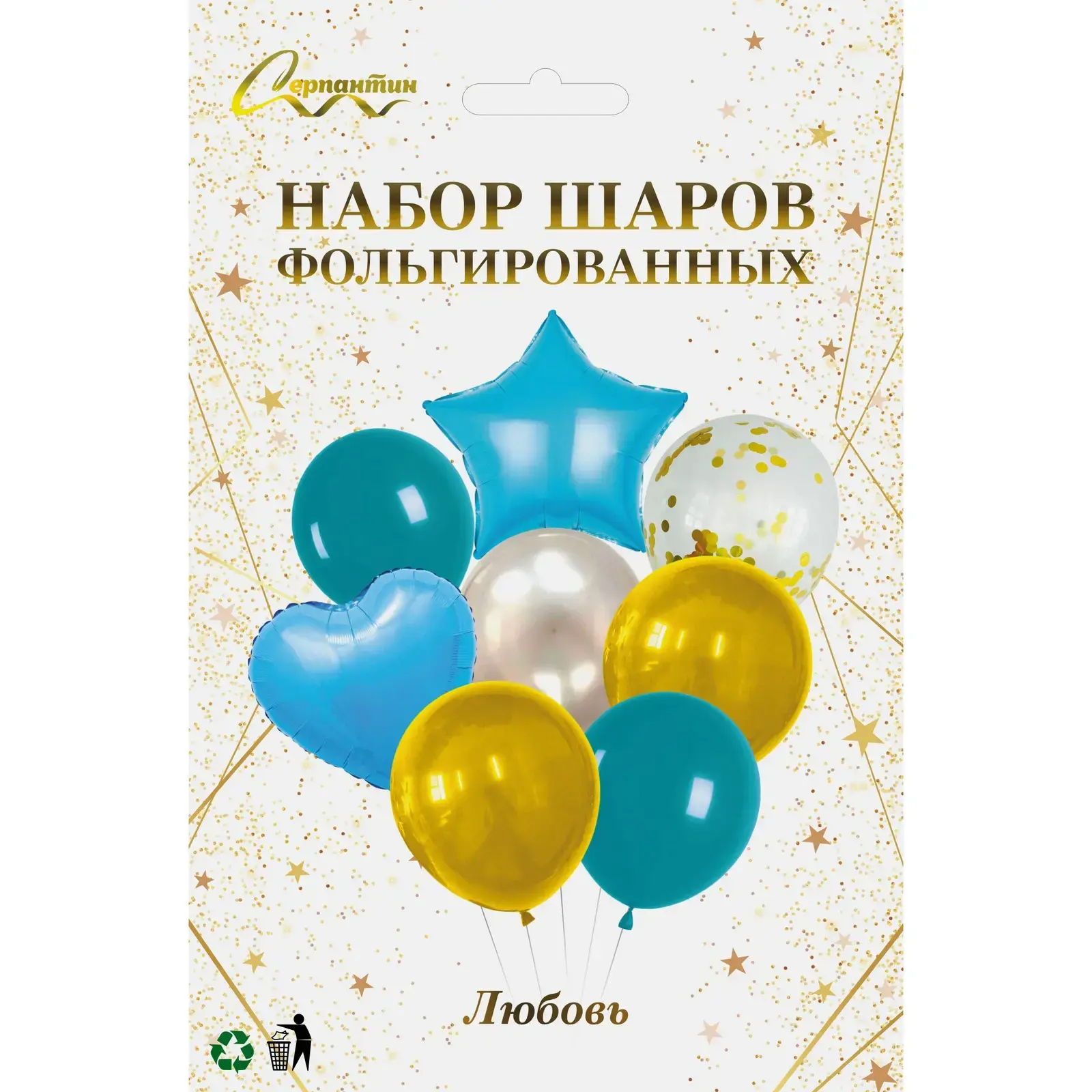 Шары в наборе представлены в различных цветах: голубом, желтом, бирюзовом и белом с золотыми блестками. Они имеют стандартный размер, что делает их универсальными для любого праздника. Упаковка оформлена в белом и золотом цветах, что подчеркивает праздничную тематику. Не упустите возможность сделать ваш праздник ярче и веселее с набором фольгированных шаров «Любовь»!