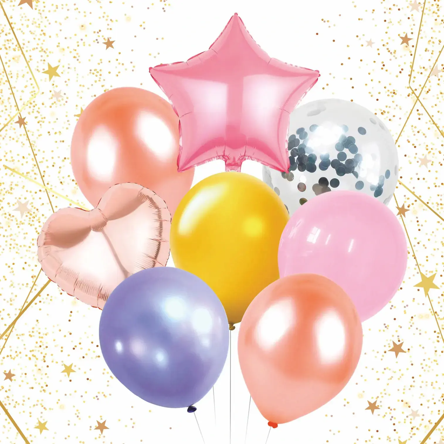 Набор включает 8 шаров различных форм: звезда, сердце и стандартные круглые шары. Они легко надуваются и могут использоваться как для украшения помещений, так и для создания оригинальных фотозон. Шары подходят для детей и взрослых, и станут отличным дополнением к любому празднику.
