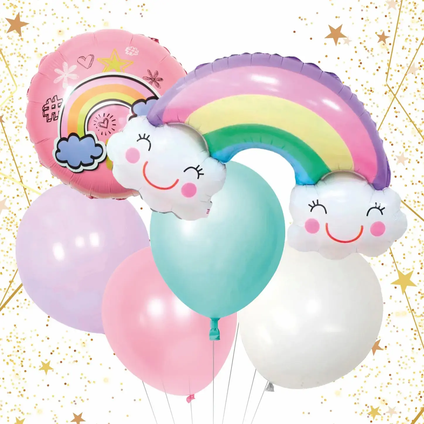 Каждый шар в наборе имеет уникальный дизайн: радужный шар украшен рисунками радуги, облаков и звезд, а облачные шары имеют улыбающиеся лица, что добавляет игривости. Размеры шаров варьируются, что позволяет создавать интересные композиции. Упаковка оформлена с золотыми блестками, что делает ее привлекательной для подарка.