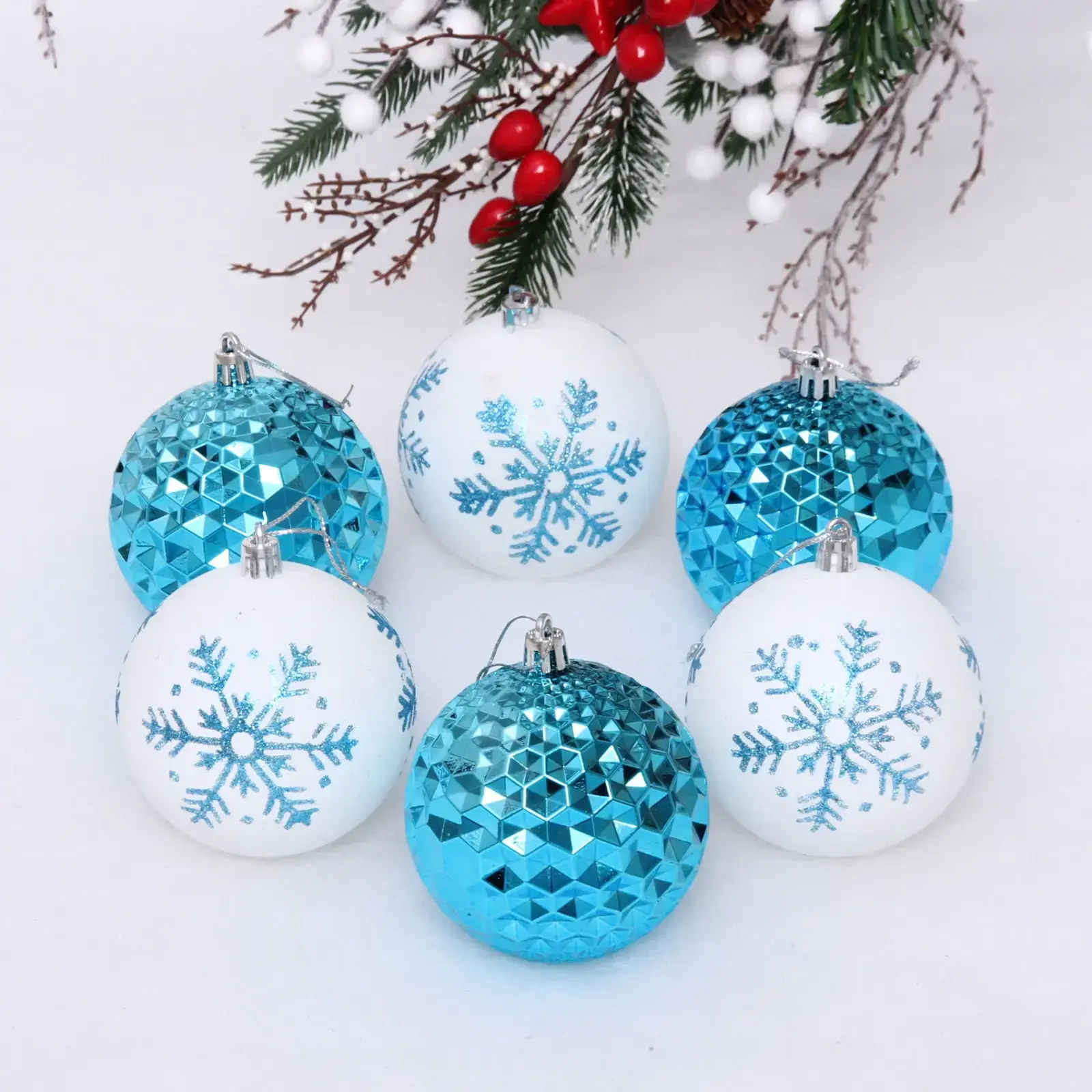Этот набор новогодних шаров станет идеальным украшением для вашей ёлки, добавляя ей изысканный и праздничный вид. Шары выполнены в нежных голубых и белых тонах, что создаёт ощущение зимней сказки и уюта. Каждый шар имеет уникальный дизайн: три белых шара украшены снежинками, а три голубых — с глянцевой и рифлёной текстурой, что придаёт им особую привлекательность.