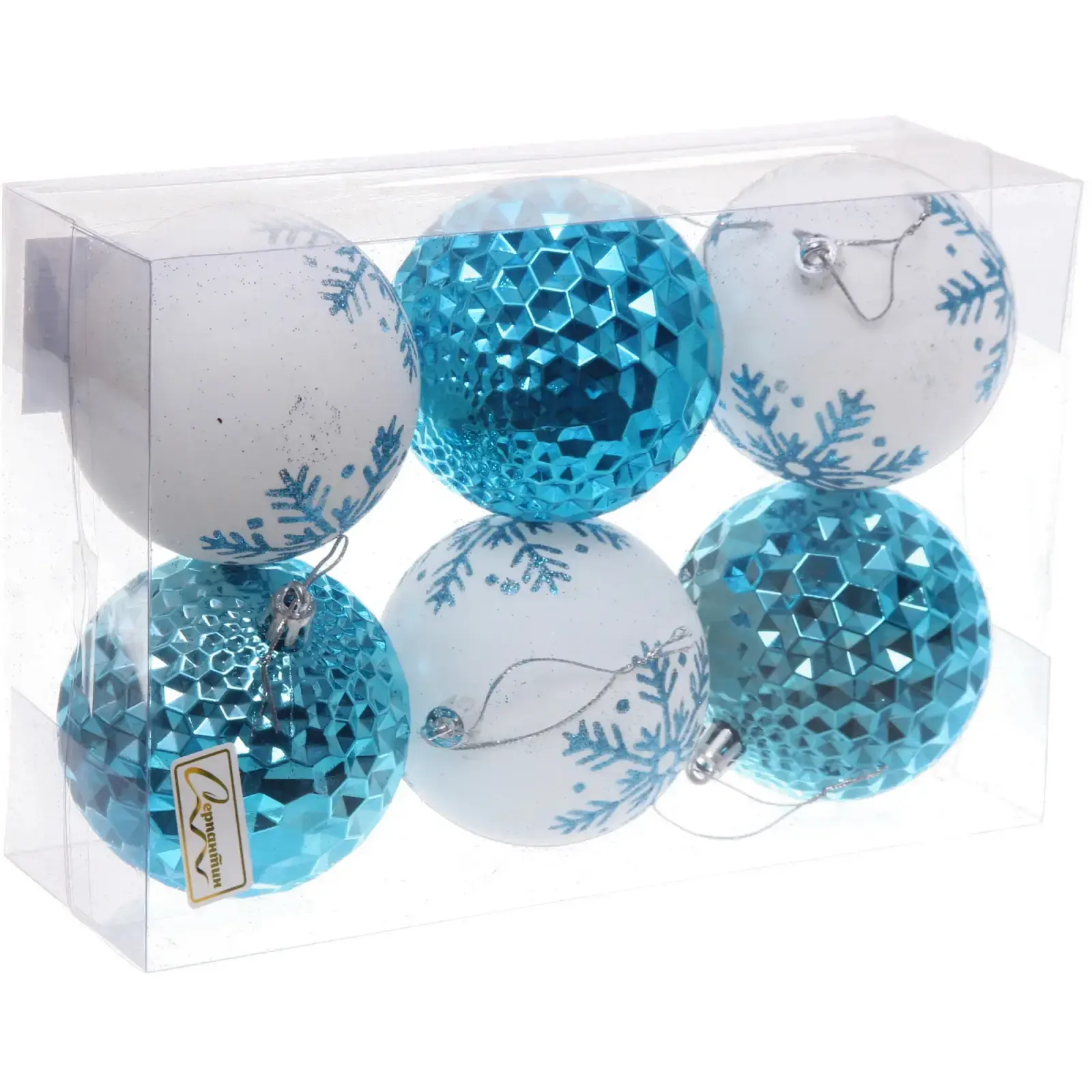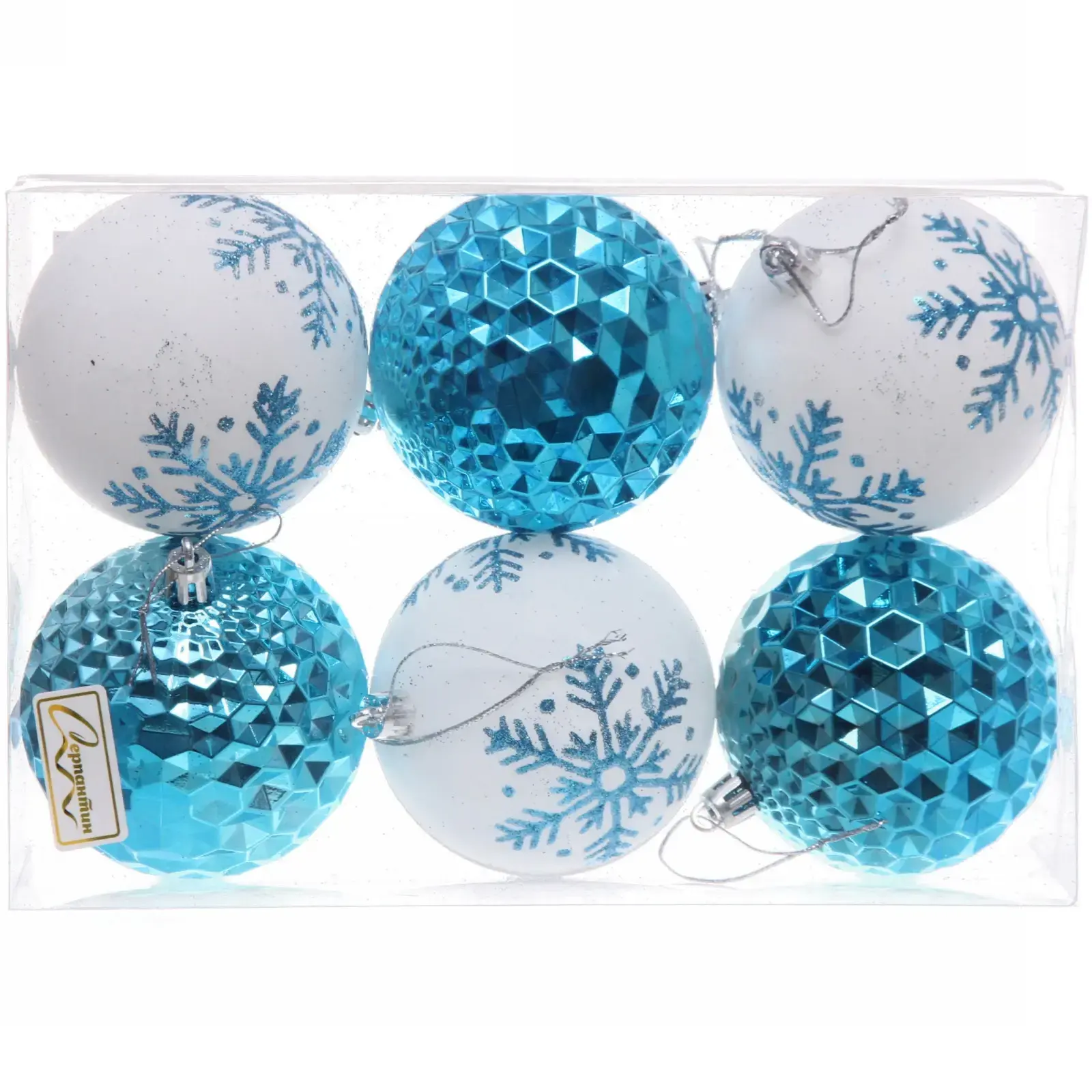 Размер каждого шара составляет 8 см, что делает их стандартными для новогоднего декора. Набор включает три белых шара с синеватыми узорами и три голубых шара с различной текстурой. Упаковка выполнена из прозрачного пластика, что позволяет видеть содержимое и делает набор отличным подарком для ваших близких.