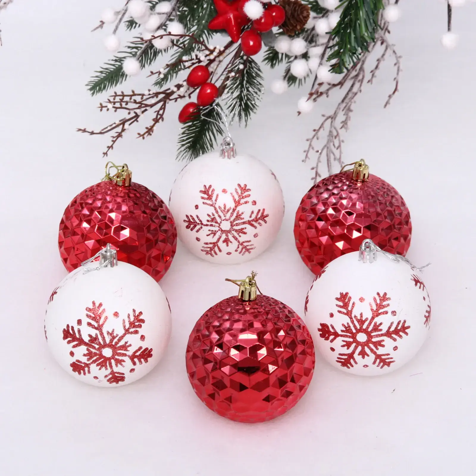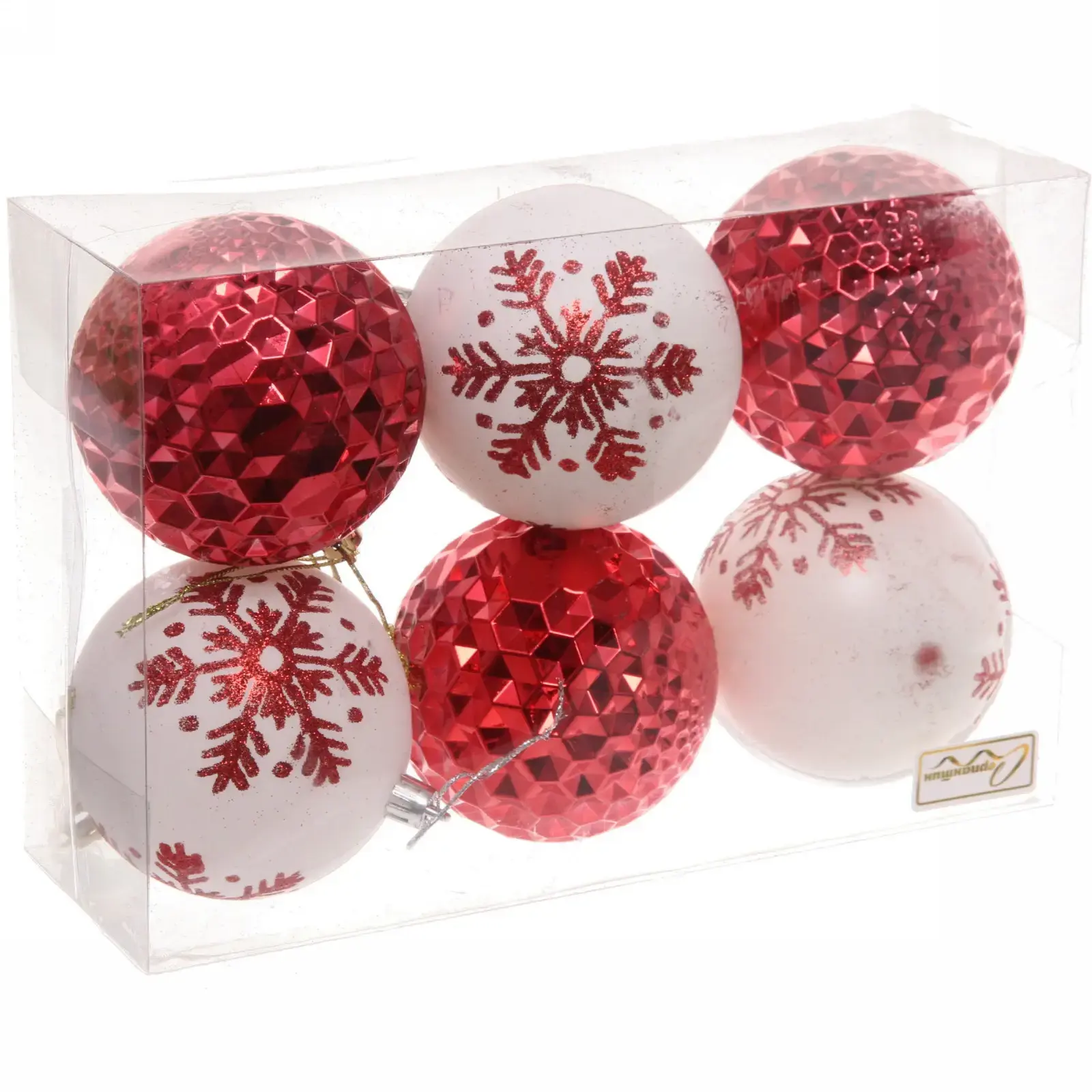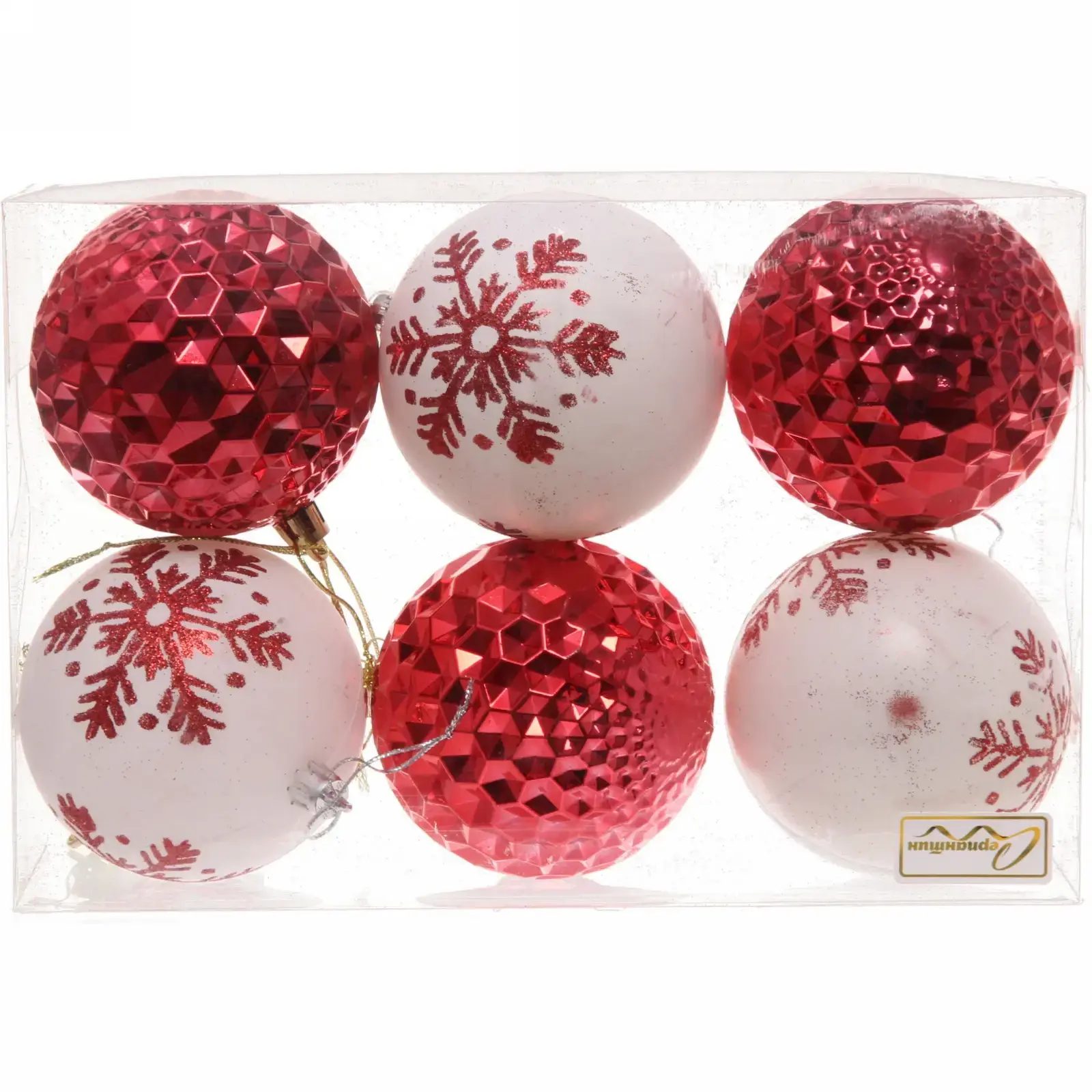 Набор состоит из шести шаров диаметром 8 см, выполненных в красном и белом цветах. Красные шары имеют гладкую и гранёную текстуру, а белые украшены золотистыми снежинками, что придаёт им особый шарм. Эти шары подойдут для любого стиля оформления, будь то классический или современный.