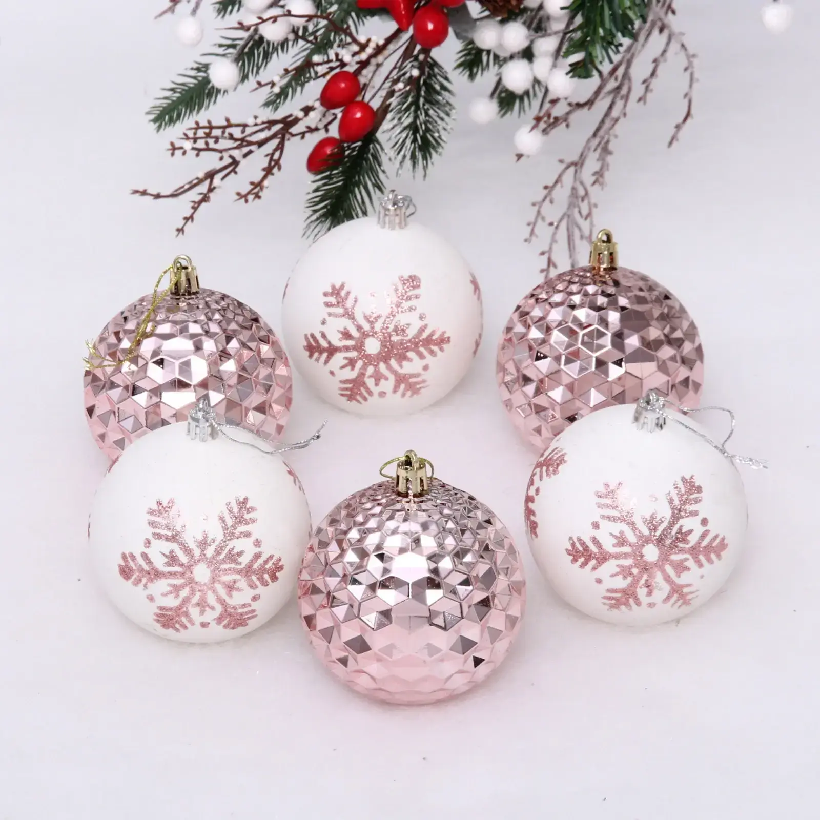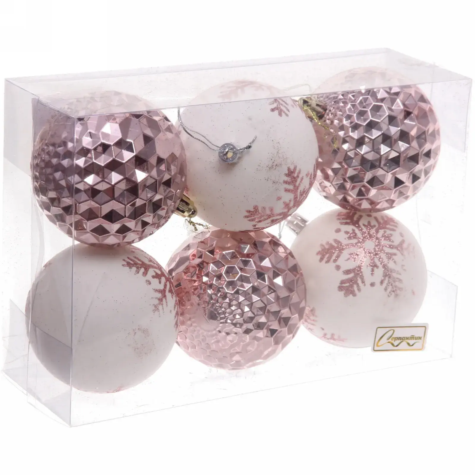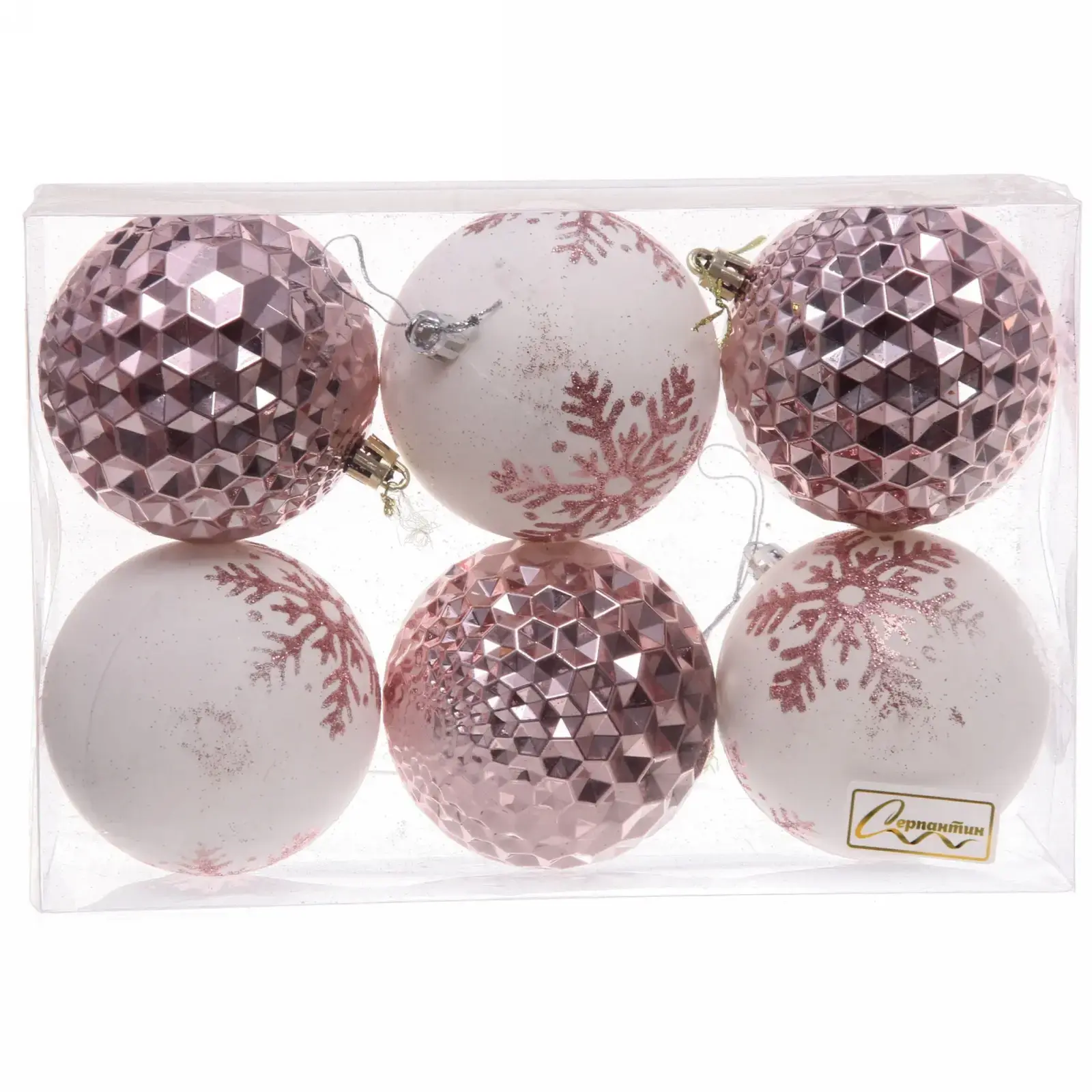 Шары имеют стандартный размер 8 см и представлены в двух цветах: розовом и белом. Белые шары украшены нежными снежинками розового цвета, что подчеркивает их праздничный дизайн. Упаковка из прозрачного пластика защищает шары от повреждений и позволяет видеть их красоту. Этот набор станет отличным выбором для тех, кто ценит стиль и качество в новогоднем декоре.