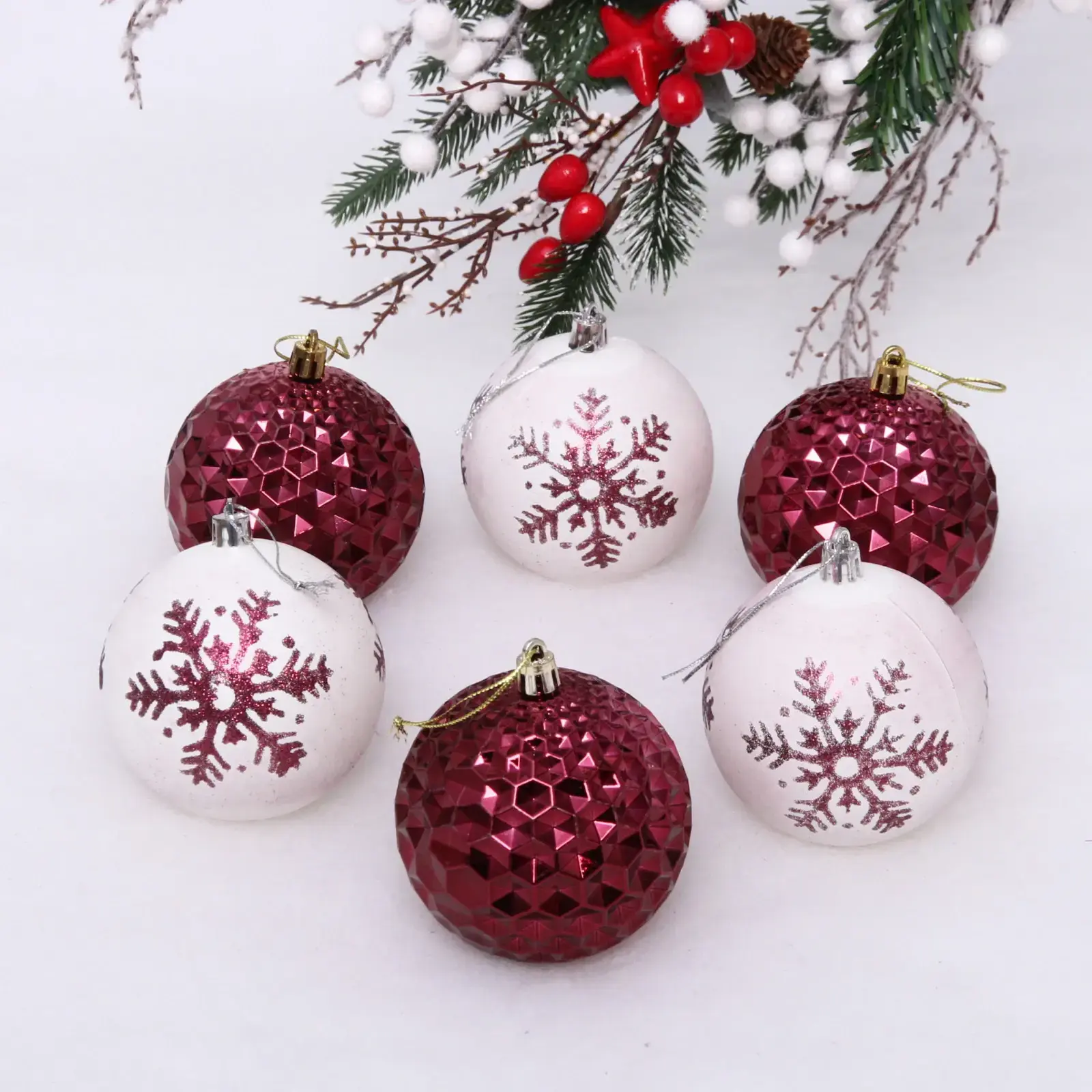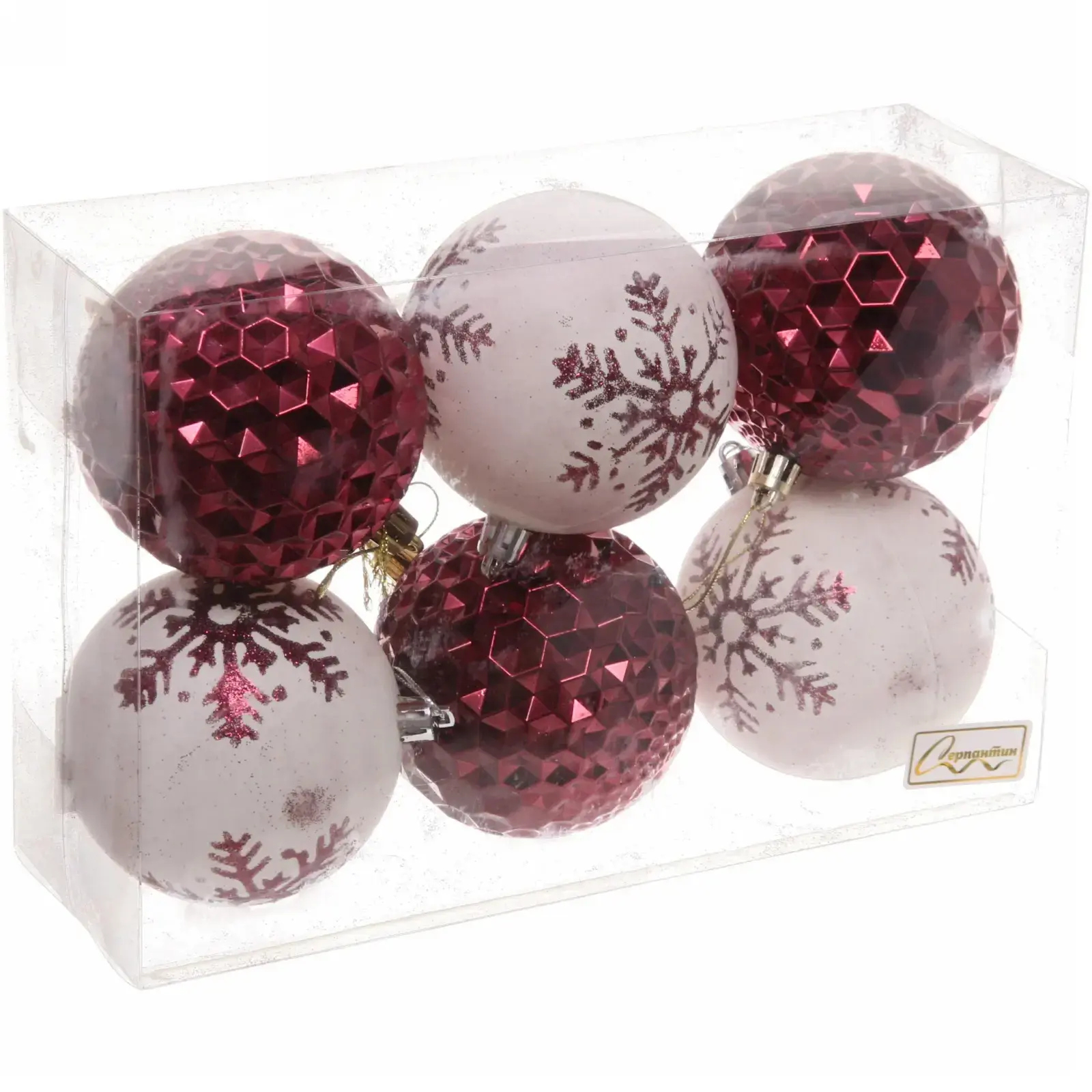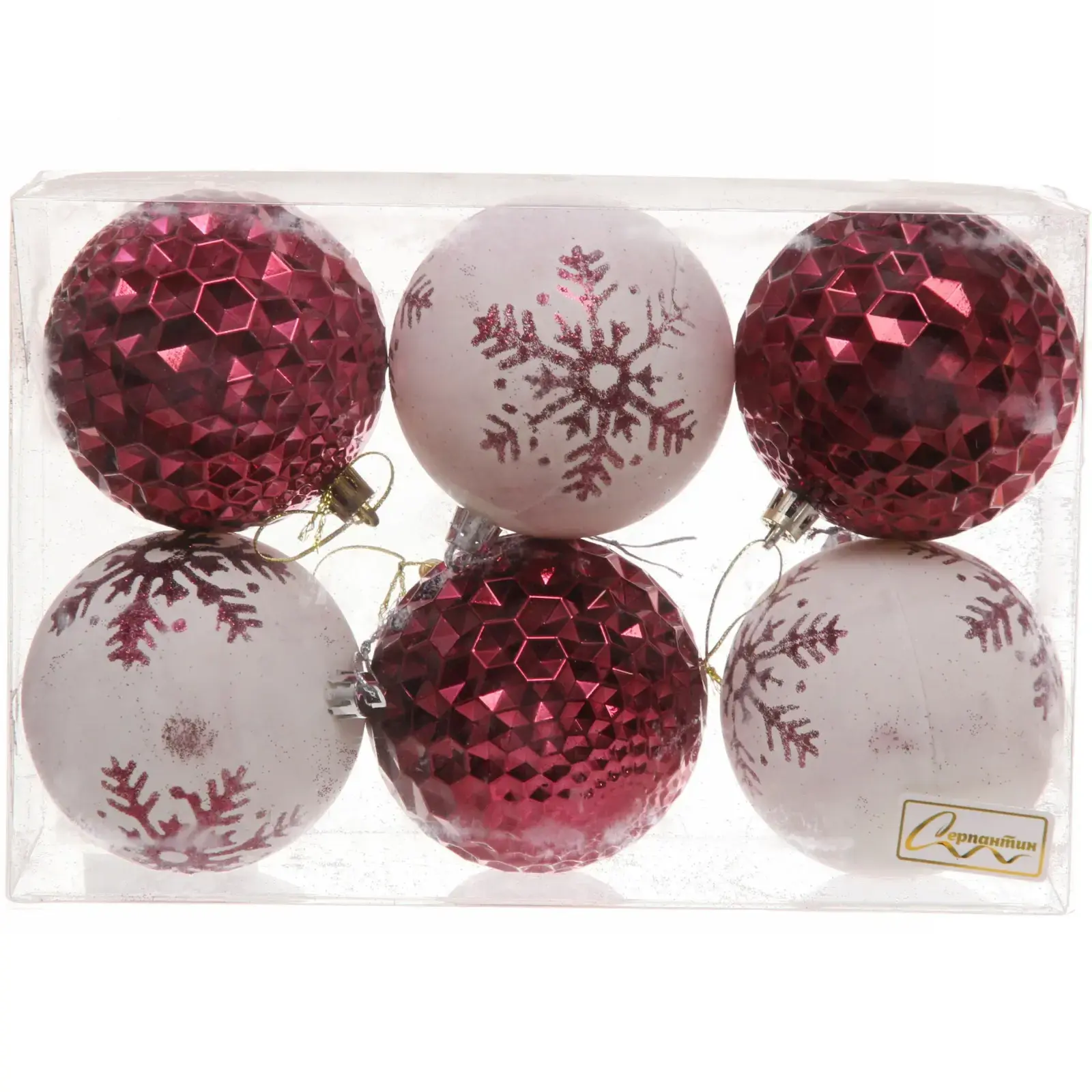 Набор состоит из шести шаров, три из которых выполнены в насыщенном рубиновом цвете с гексагональной отражающей текстурой, а три белых украшены снежинками, выполненными в розовом цвете. Шары имеют стандартную круглую форму и подходят для подвешивания на елку или использования в других декоративных целях. Они легко крепятся благодаря металлическим петелькам, что делает процесс декорирования простым и удобным.
