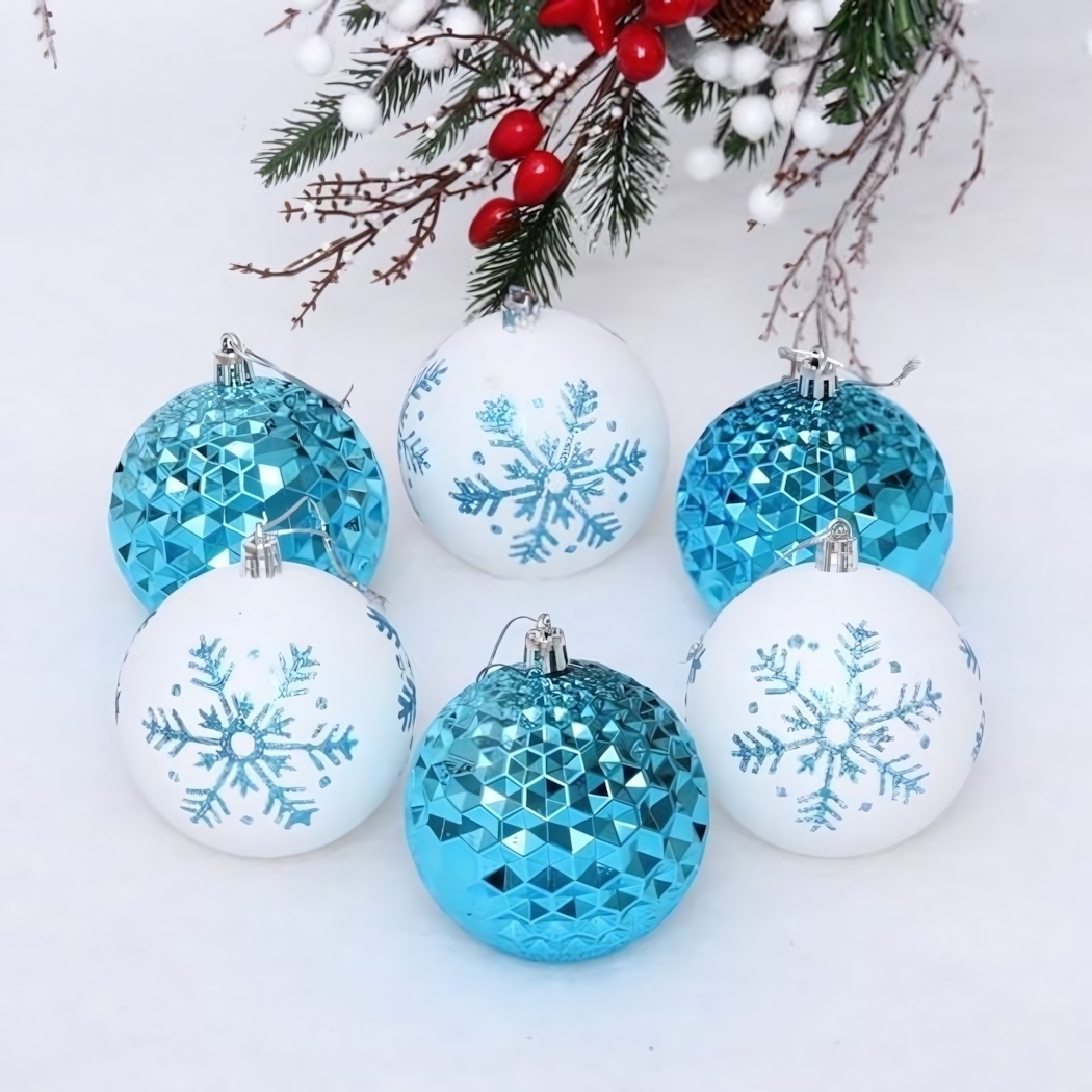 Набор из шести шаров диаметром 8 см «Снежное сияние» превращает любую ёлку в сказочный лес, где каждый луч света отражается в нежных снежинках. Гладкая блестящая поверхность и гармоничное сочетание голубого и белого цветов добавляют ощущение свежести зимы и делают украшение ярким центром внимания.