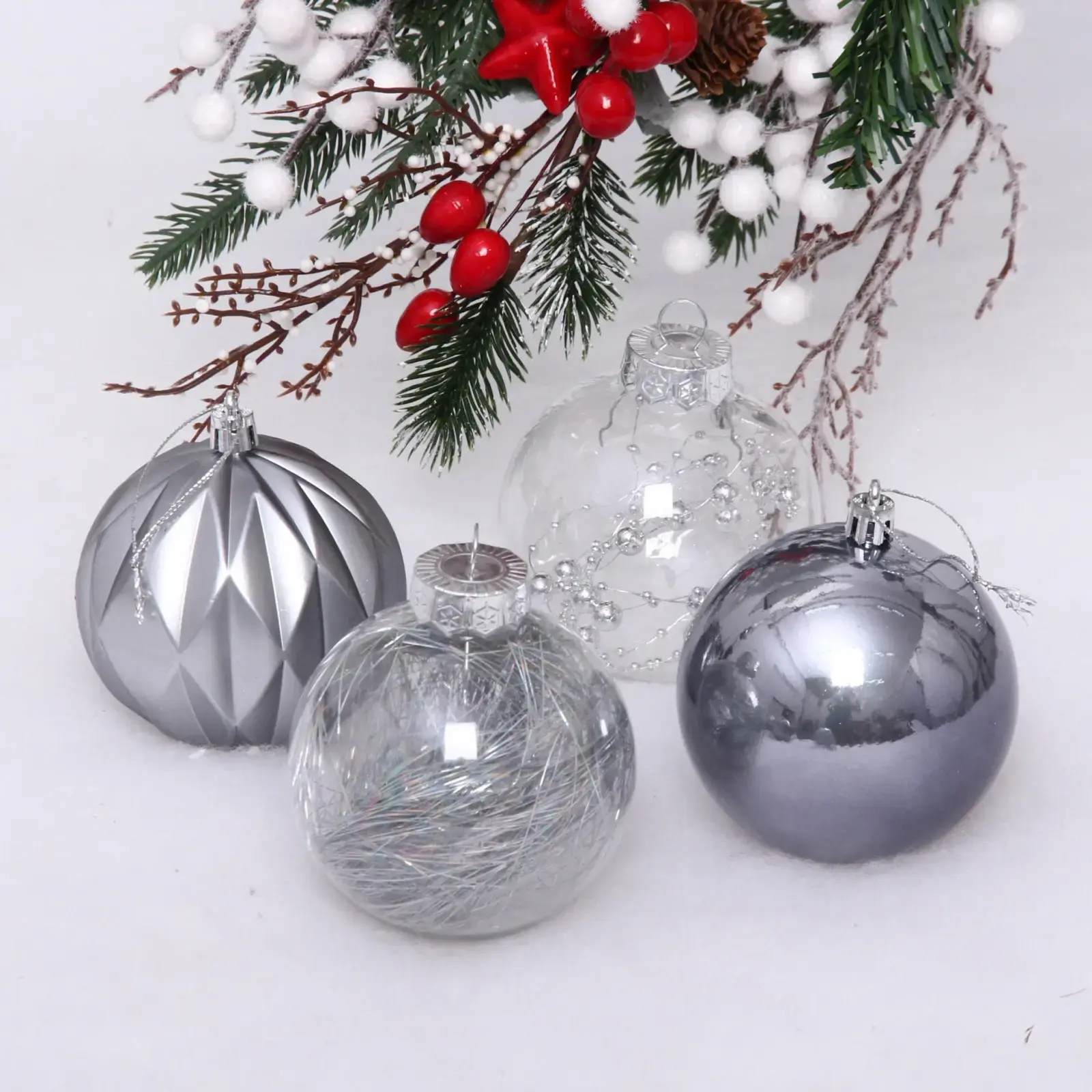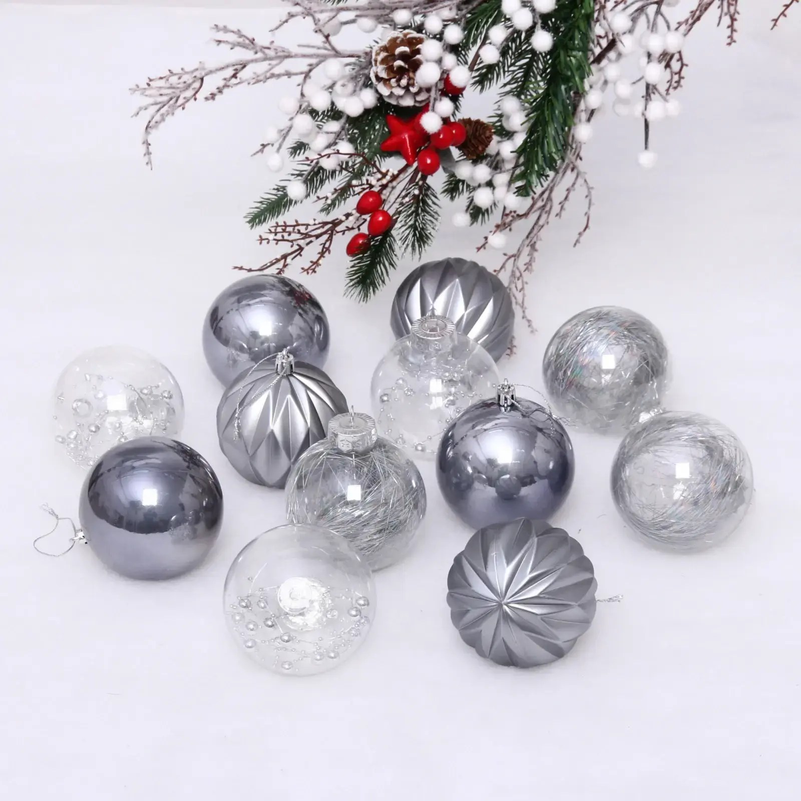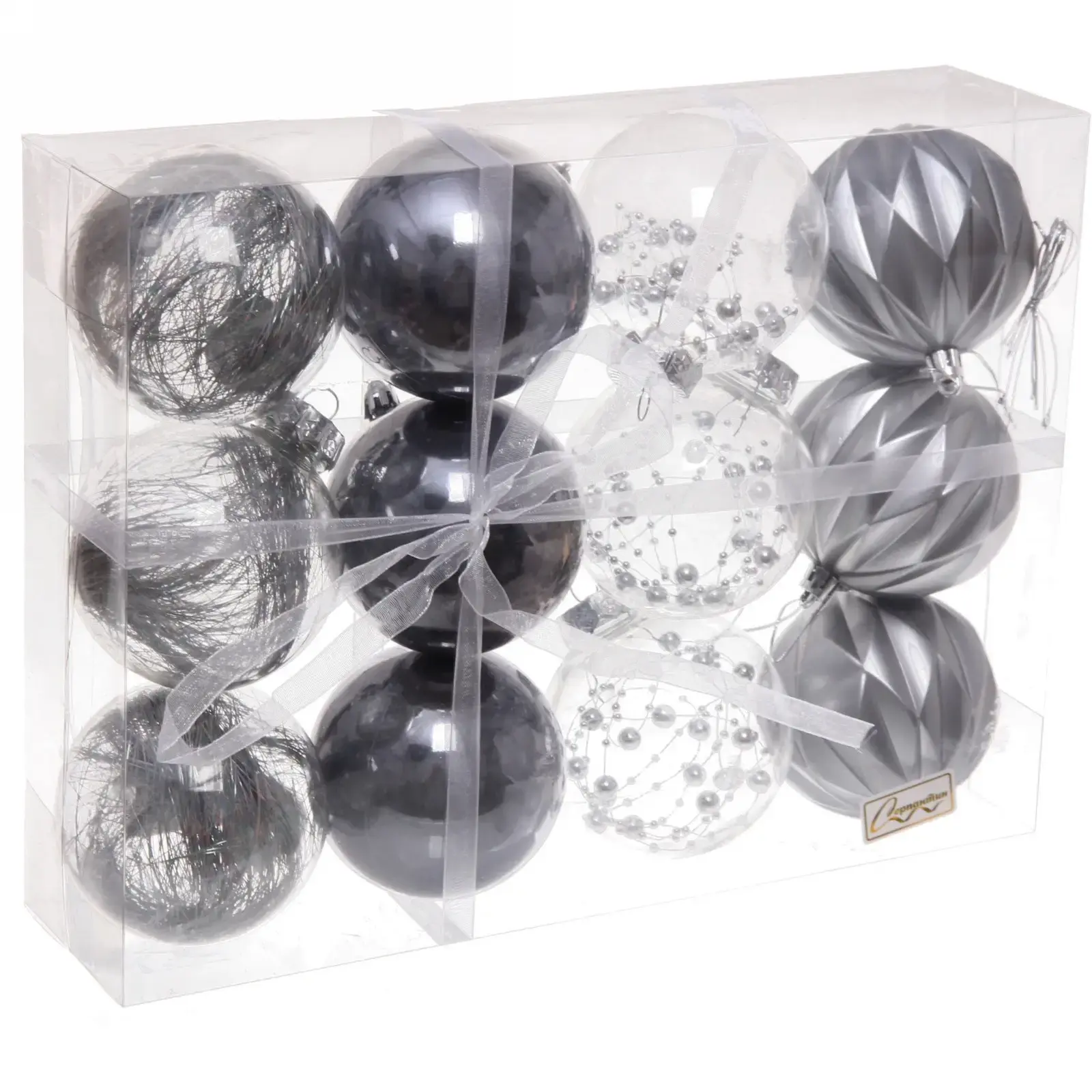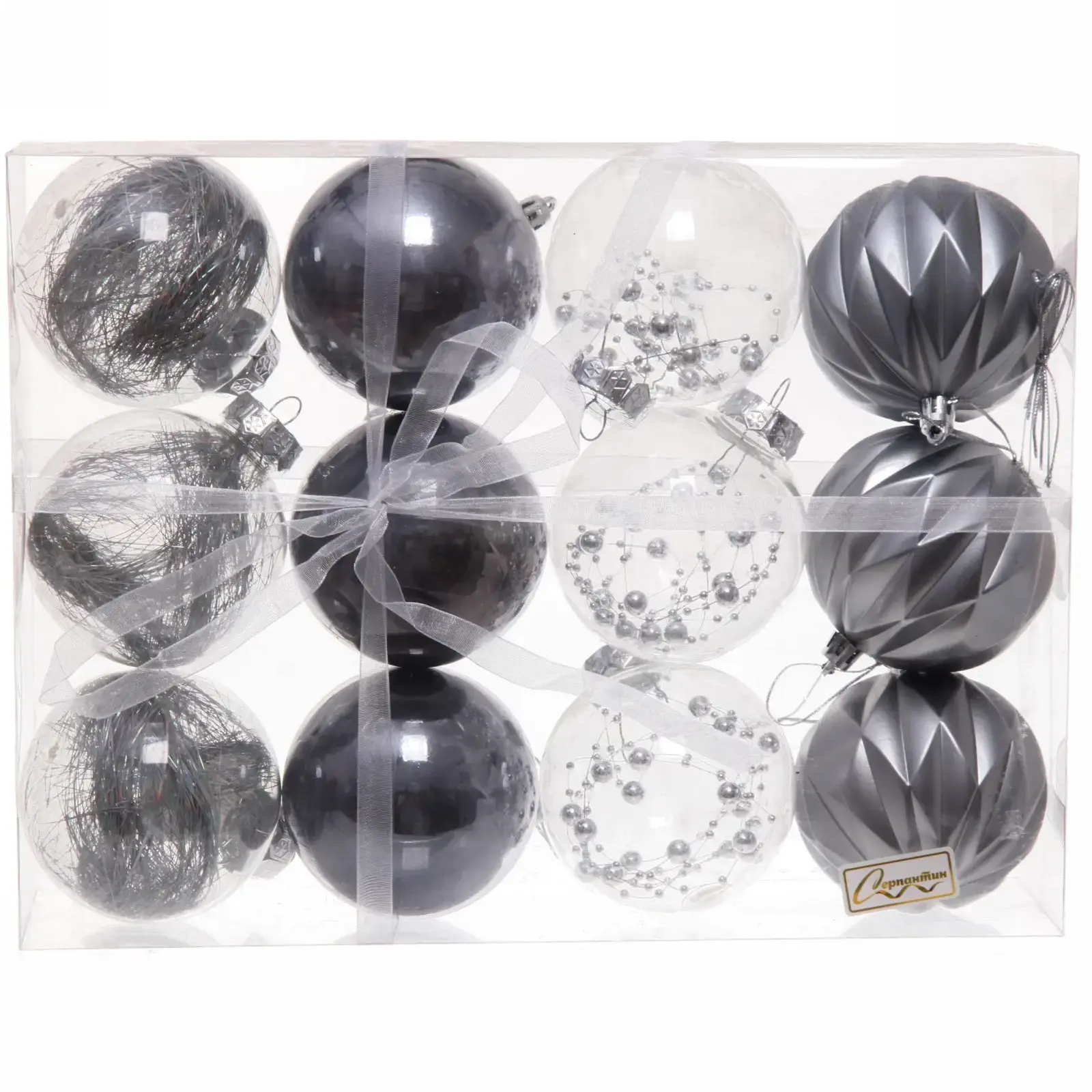 Каждый шар имеет стандартный размер 8 см, что делает их универсальными для любого стиля украшения. Цветовая гамма включает графитовые и прозрачные элементы, что добавляет изысканности и элегантности. Упаковка с лентой делает набор отличным подарком для ваших близких.