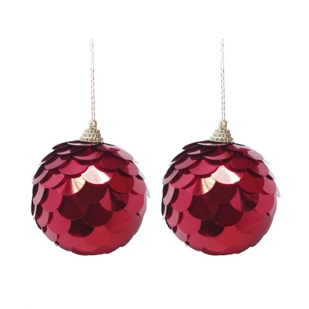 Каждый набор содержит 2 штуки, диаметр каждого шара 8 см, материал – качественный пенопласт, покрытие – чешуйчатый блеск, цвет – насыщенный красный.