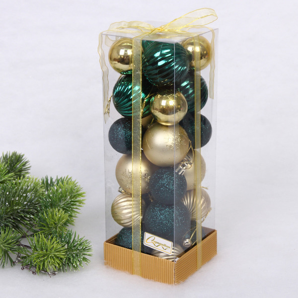 Набор шаров «Christmas» включает 24 предмета, что позволяет вам украсить не только елку, но и другие элементы декора. Шары легко подвешиваются благодаря петелькам, а разнообразие текстур (гладкие, рифленые, блестящие и матовые) добавляет интересные акценты в оформление. Подходит для использования как в домашних условиях, так и для оформления общественных пространств.