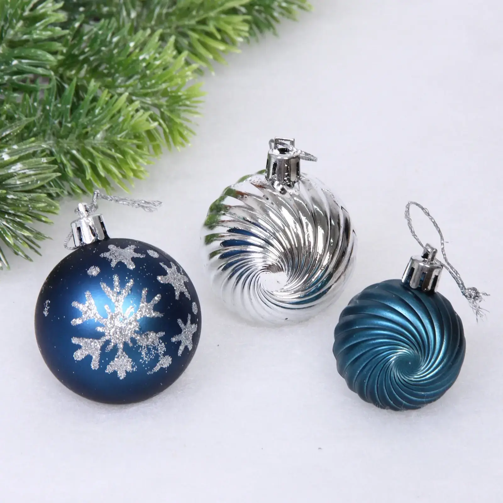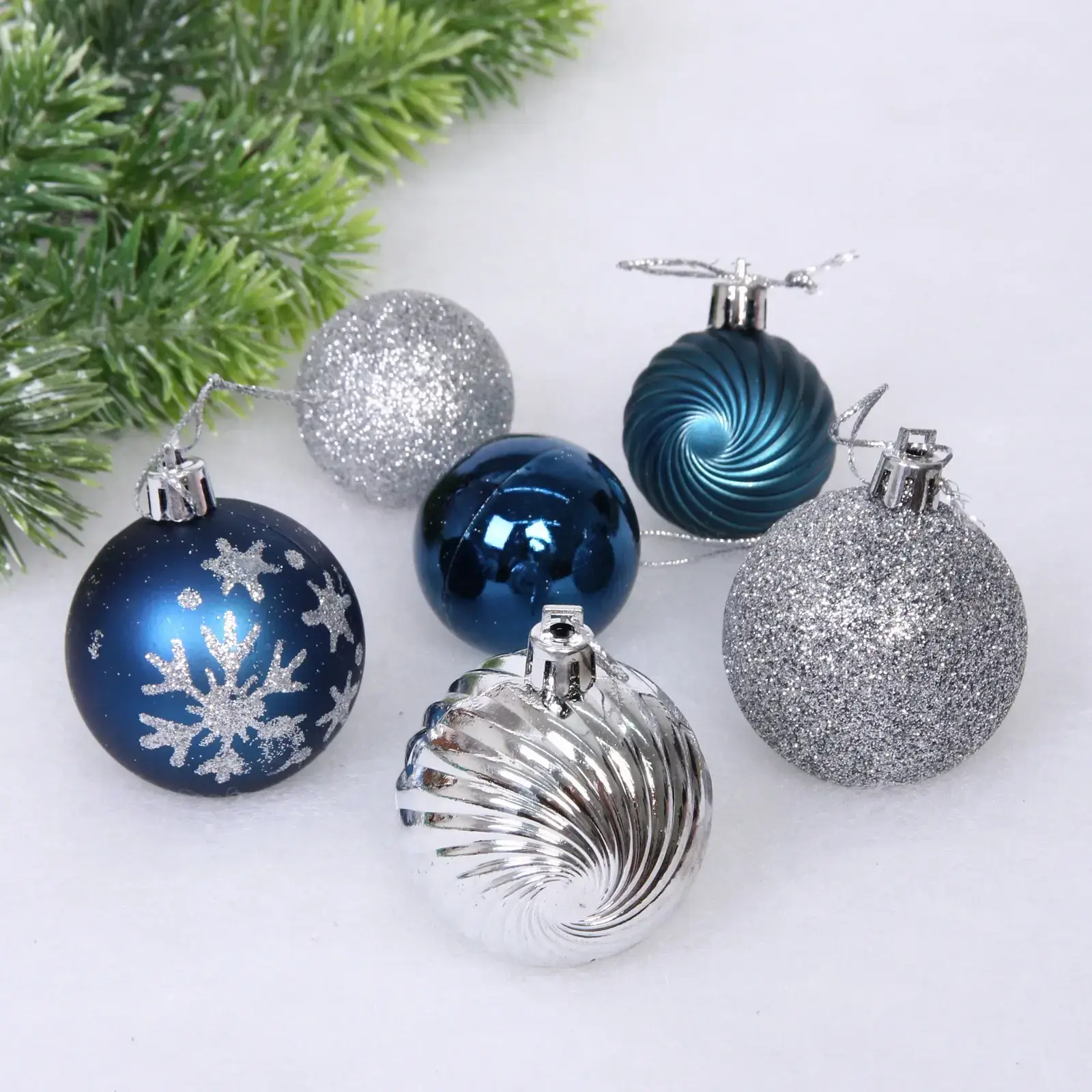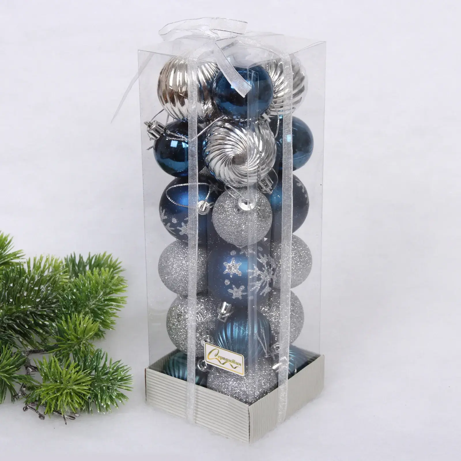 Создайте волшебную атмосферу на Новый год с набором шаров «Christmas». Эти яркие и стильные украшения добавят изысканности и уюта в ваш дом. Шары выполнены в красивых цветах сапфира и серебра, что делает их идеальными для любого интерьера. Каждый шар имеет уникальный дизайн, включая рифлёные поверхности и узоры в виде снежинок, что придаёт им особый шарм.