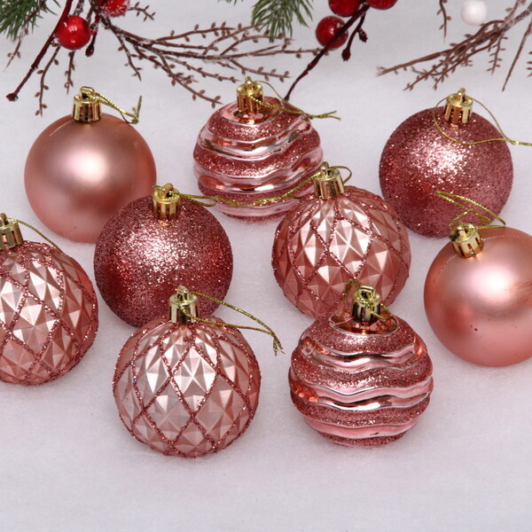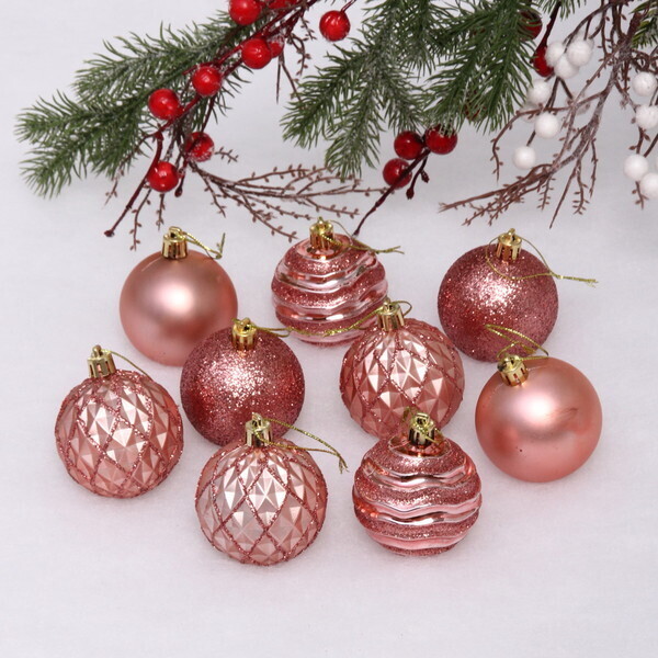 Этот набор шаров станет идеальным дополнением для вашего новогоднего декора. Сочетание розового золота и разнообразных текстур придаст вашему интерьеру уникальный стиль и атмосферу праздника. Шары диаметром 6 см выполнены из прочного пластика, что обеспечивает их долговечность и надежность. Они прекрасно подойдут для украшения новогодней елки, а также могут использоваться в качестве самостоятельного декора для создания праздничного настроения.