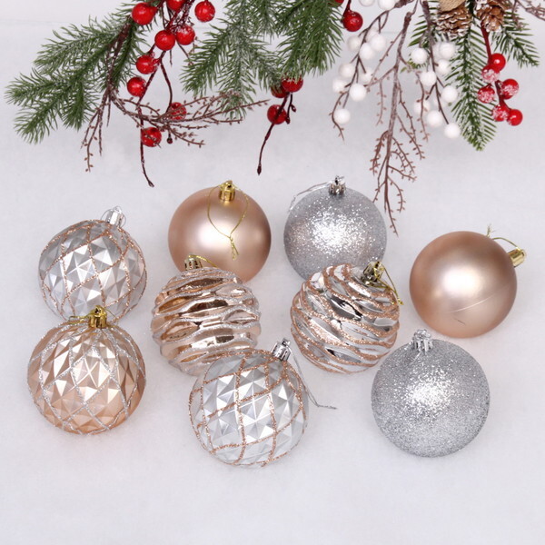 Каждый шар диаметром 8 см снабжен золотистой подвесной петлей для удобного размещения на ветках. Легкий вес пластика позволяет декорировать даже хрупкие еловые лапы без риска поломки.