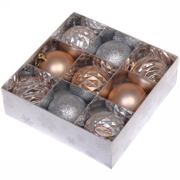 Эти изысканные украшения сочетают благородные металлические оттенки и разнообразие текстур, чтобы ваша ель заиграла переливающимися акцентами. Идеальный выбор для тех, кто ценит гармонию в деталях.